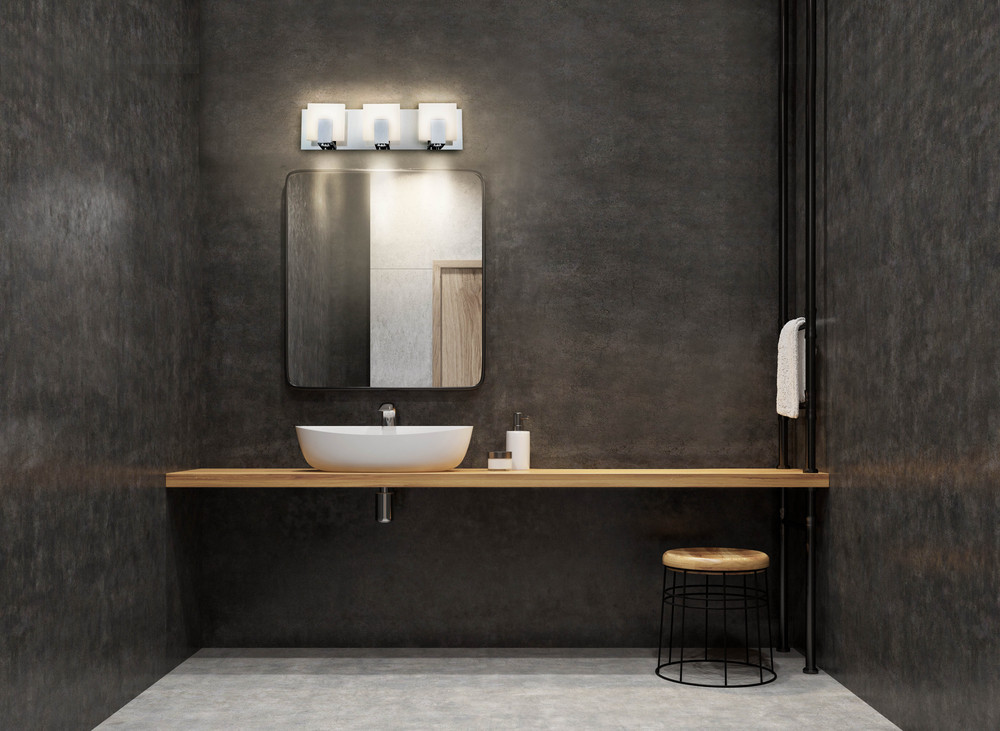 Illuminated frosted acrylic diffusers vertically seated on a chrome frame housing a subtle LED downlight