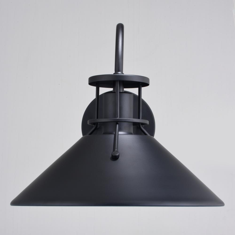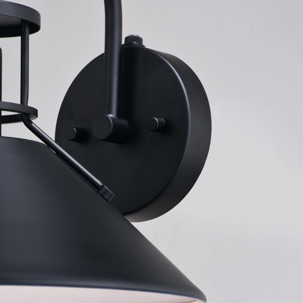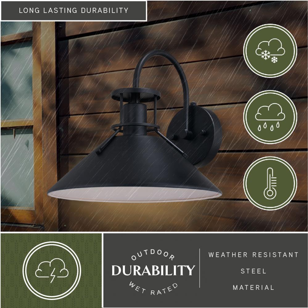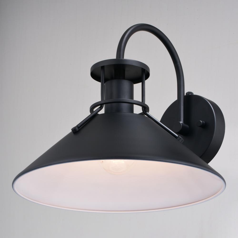 The Canton collection speaks loudly to industrial and farmhouse charm. The black metal shade, with glossy white inner, tapers outward to generate the utmost light below. A small cage-like structure adds a level of sophisticated industrial detail. Add this outdoor wet rated wall light to any garage, porch, entry or even bath space for that edgy touch of flair. It has a built-in dusk to dawn photocell that automatically turns the light on at dusk and turns it off at dawn, saving energy during daylight hours.