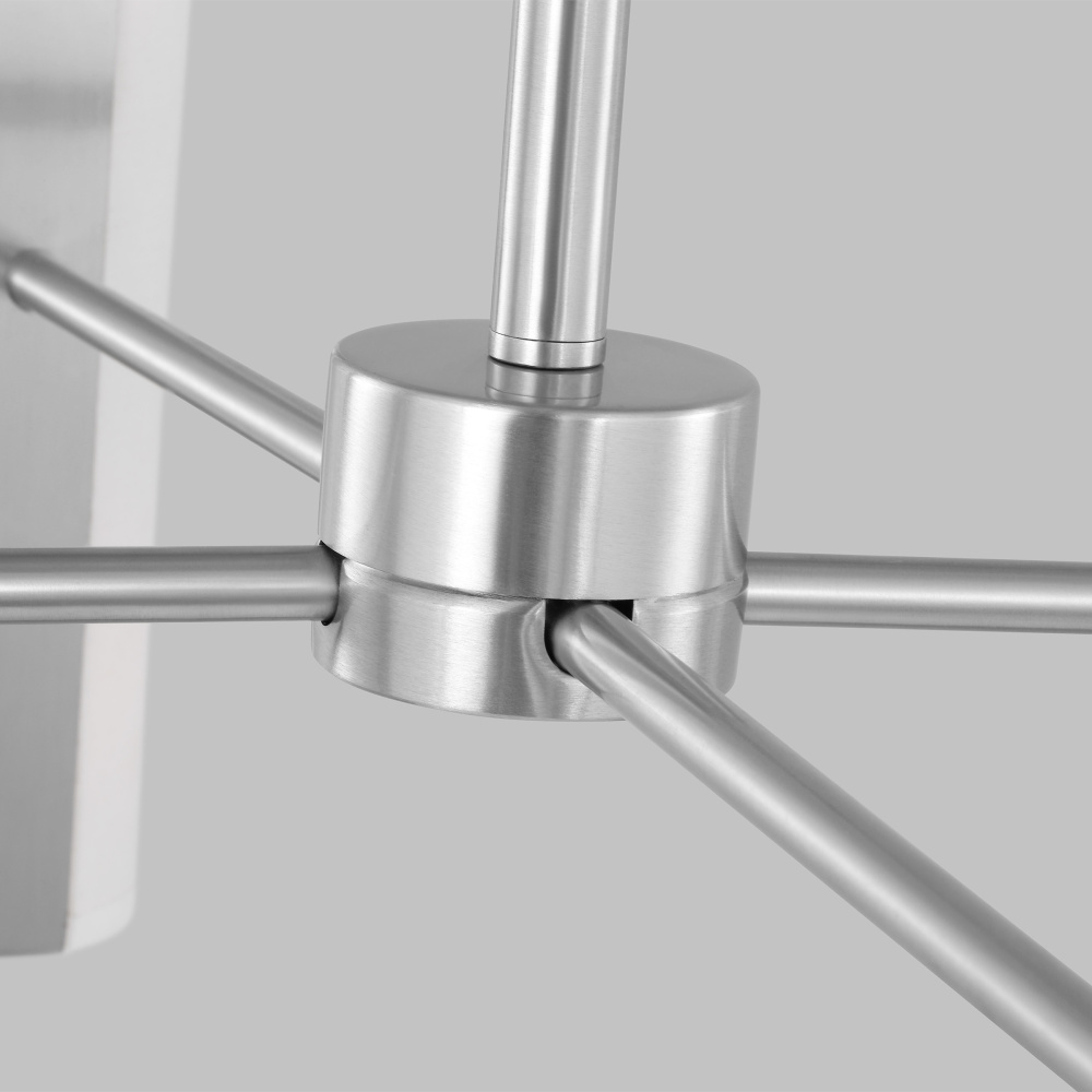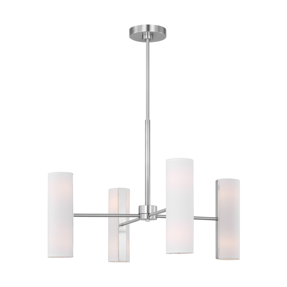 Sleek and modern, this contemporary collection features cylindrical linen shades and a visible flat spine for a clean look. It features a candelabra-style fixture with four sleek arms referencing mid-century modern design. On the end of each arm, frosted glass shades direct soft light in both directions.