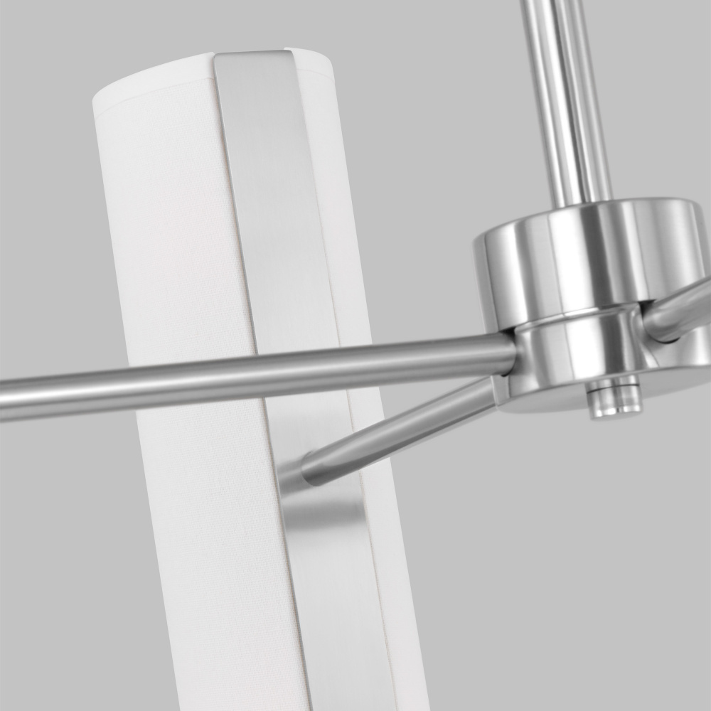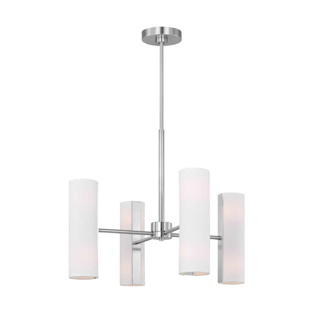 Sleek and modern, this contemporary collection features cylindrical linen shades and a visible flat spine for a clean look. It features a candelabra-style fixture with four sleek arms referencing mid-century modern design. On the end of each arm, frosted glass shades direct soft light in both directions.