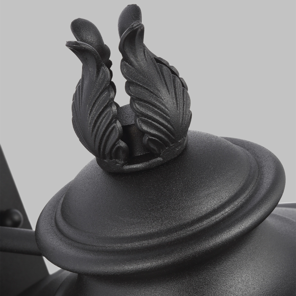 The Cape May one light outdoor wall fixture in black enhances the beauty of your property, makes your home safer and more secure, and increases the number of pleasurable hours you spend outdoors. The Cape May outdoor lighting collection by is a regal, traditionally styled lantern collection. Design elements include leaf ornamentation on the back plate and finial arms as well as the beautiful combination of the Burled Iron finish and Etched Hammered glass with Light Amber Tint to offer a warm glow. The assortment includes a small one-light outdoor wall lantern (available in a Dark Sky version too), a medium one-light outdoor wall lantern, a large one-light outdoor wall lantern, an extra-large one-light outdoor wall lantern, a one-light outdoor post lantern, a one-light outdoor pendant and a one-light ceiling flush mount. Both incandescent and LED ENERGY STAR-qualified lamping available, and most of these fixtures easily convert to LED.