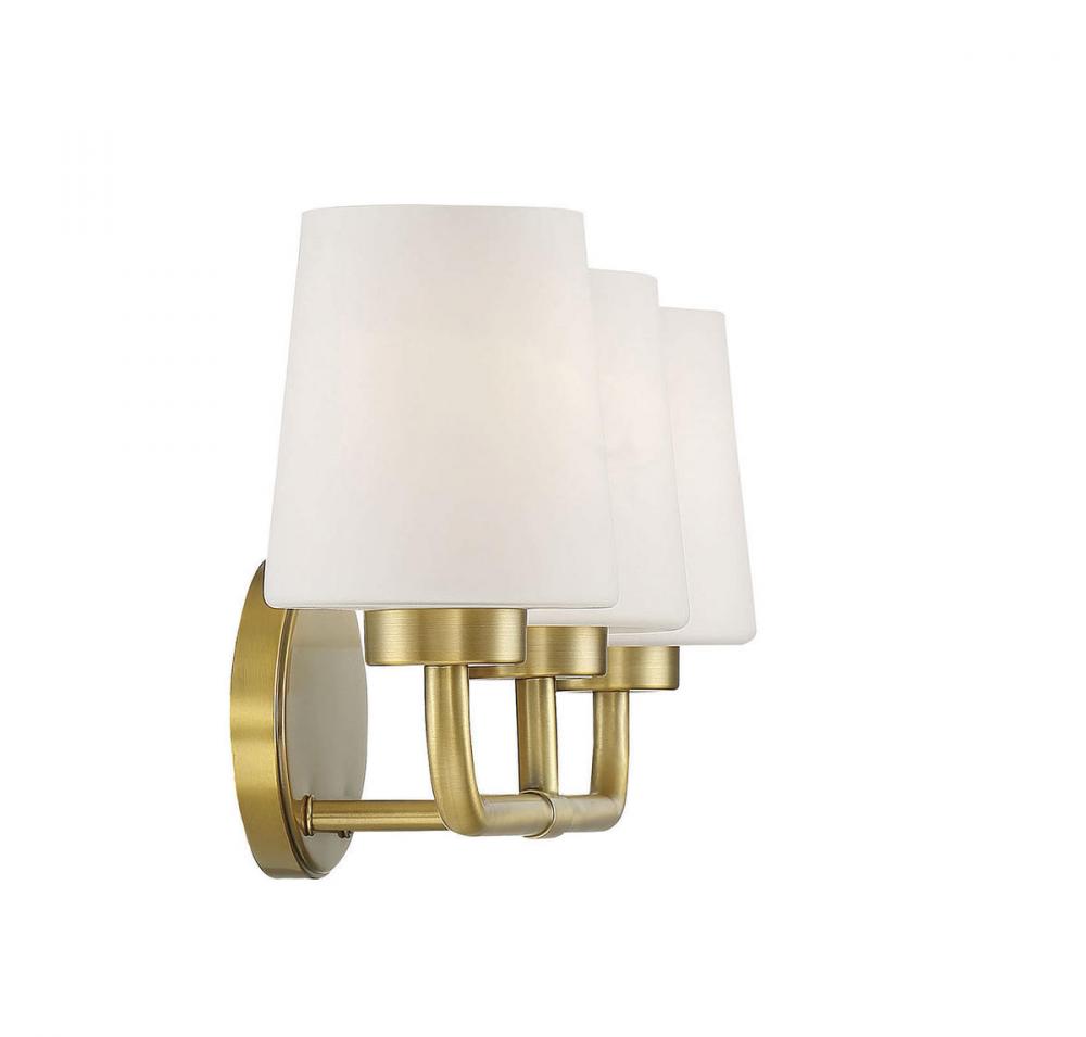Add chic style to any bathroom with the Savoy House Capra 3-light bath bar. Its substantial structure features classic details along with white opal glass shades that are tapered like lamp shades and open at the top to give off a flattering glow. The large oval-shaped backplate helps to cover up any holes left behind from replacing old bath bars, too. Plus, the hardware for this fixture has been thoughtfully moved to the side of the backplate, allowing for a crisp and clean look. Finished in warm brass. This fixture is 22" wide and 9" tall. It extends 6.5" from the wall. Uses 3 standard size bulbs of up to 60 watts each (not included).