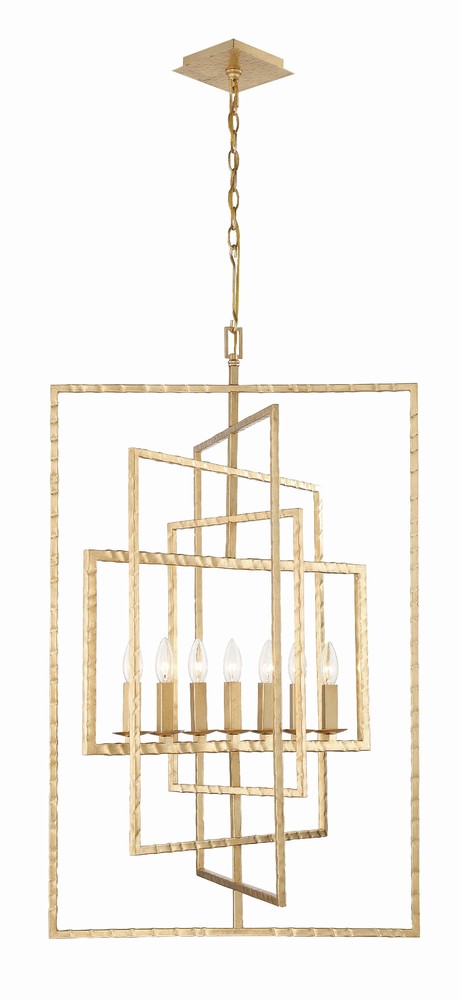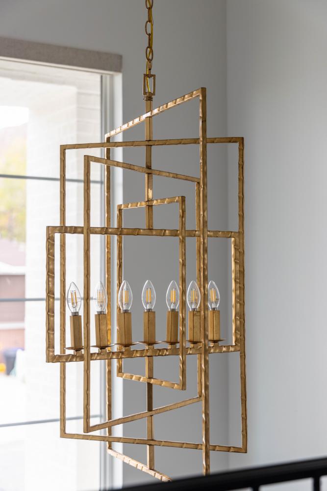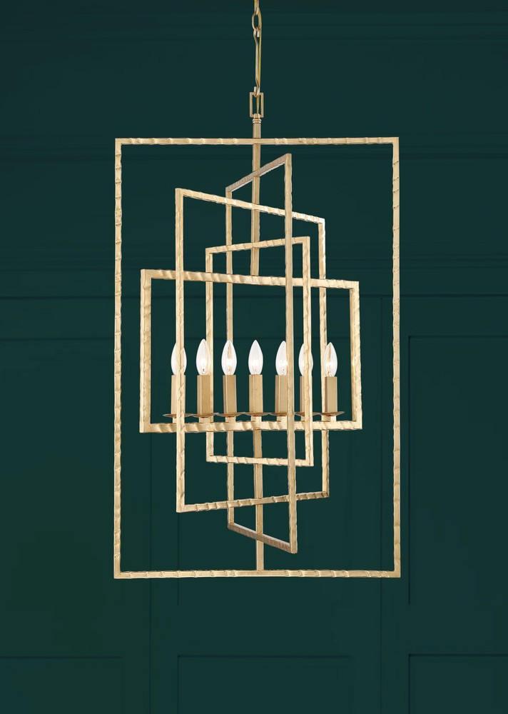 A conversation piece, the Capri chandelier's geometric design, gives the fixture an architectural feel. Designed with hammered rectangle adjustable geometric rings, the Capri can be rearranged to suit your needs.