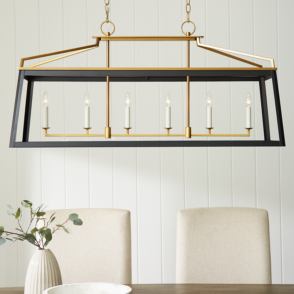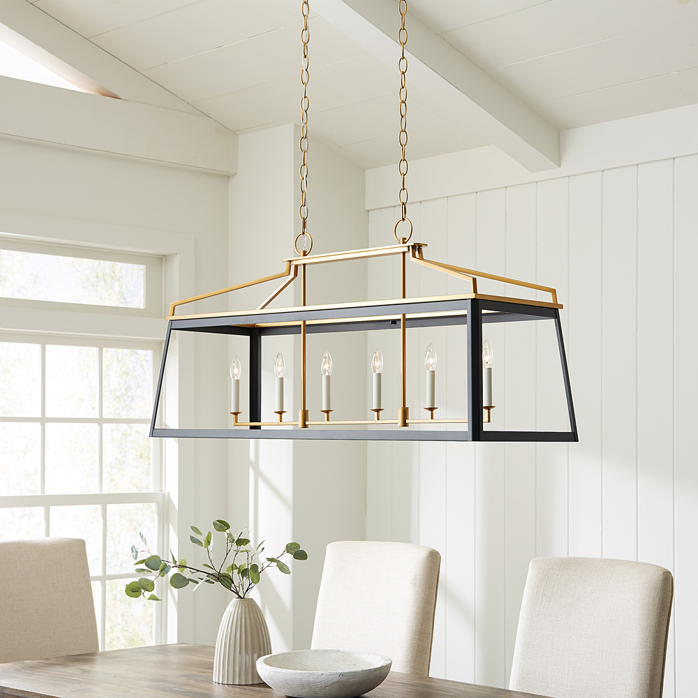 The Carlow six-light billiard island chandelier in midnight black is a traditional tapered square lantern that is wider at the base and smaller at the top. The lantern's body has either a black or white metal frame suspended from, and accentuated by, a brass square tube armature. The brass armature is the focal point of the design and almost looks like a crown on top of the lantern frame.