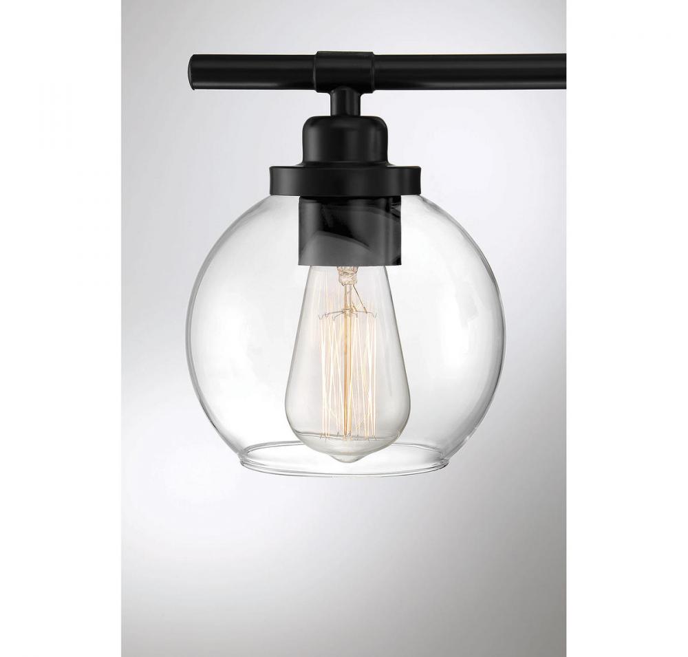 Adding the Savoy House Carson 2-light bath bar easily helps you boost the illumination and the style of any bathroom. Its fishbowl-style clear glass shadesmake a big statement and are open at the bottom, making it easy to replace the bulbs. The streamlined structure offers up subtle detailing with a mid-century modern vibe and the circular backplate echoes the shape of the glass shades. Finished in matte black. This fixture is 14" wide and 8.5" tall. It extends 7" from the wall. Uses 2 standard size bulbs of up to 60 watts each (not included).