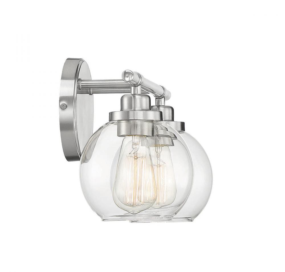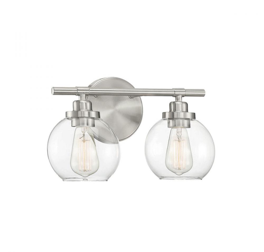 Adding the Savoy House Carson 2-light bath bar easily helps you boost the illumination and the style of any bathroom. Its fishbowl-style clear glass shades make a big statement and are open at the bottom, making it easy to replace the bulbs. The streamlined structure offers up subtle detailing with a mid-century modern vibe and the circular backplate echoes the shape of the glass shades. Finished in satin nickel. This fixture is 14" wide and 8.5" tall. It extends 7" from the wall. Uses 2 standard size bulbs of up to 60 watts each (not included).