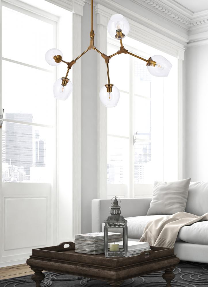 The daring Cavoli pendant lamp in a brass finish is designed with 5 lights that connect at various angles, illuminating your rooms and ridding them of darkness. The winding paths end with a light encapsulated within a clear shade at each point. This contemporary blend of art and function results in this light that will shine beautifully in any space it adorns.