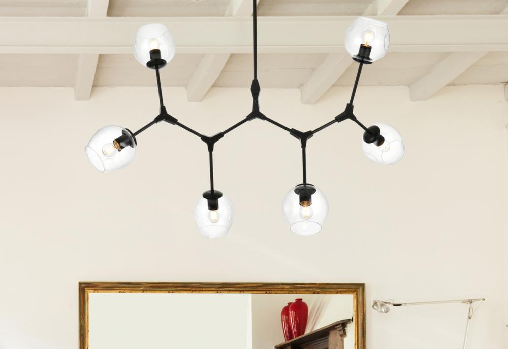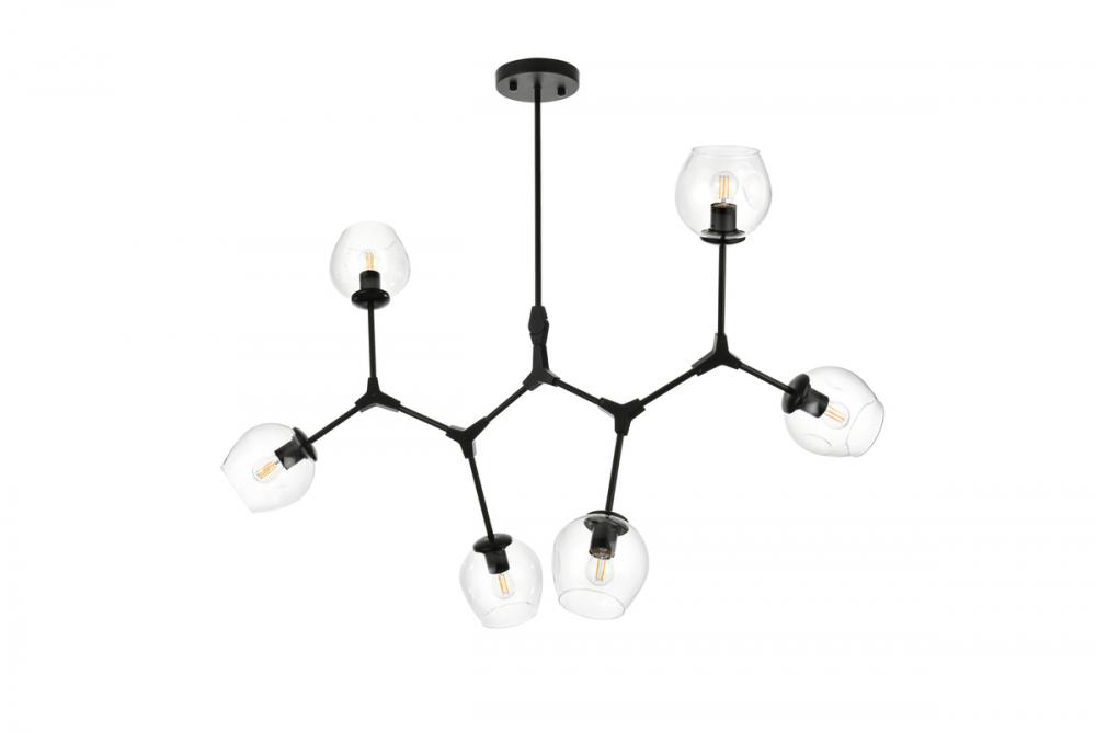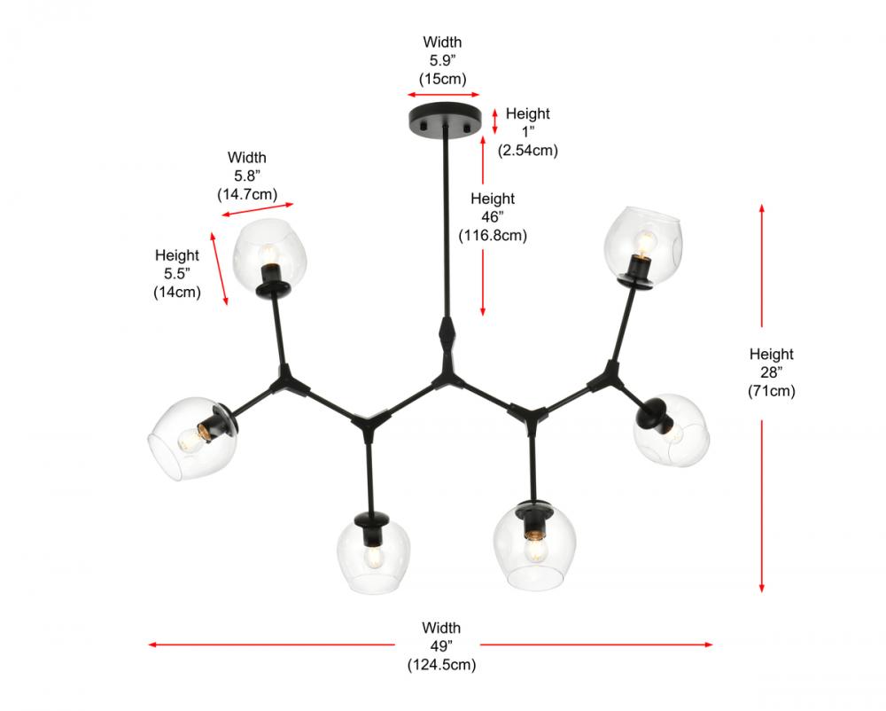 Introducing the Cavoli 49-Inch Chandelier, a perfect fusion of contemporary design and geometric allure. Crafted from durable iron, this visually captivating centerpiece not only adds a sleek modern aesthetic to your space but also ensures a robust and enduring lighting solution. The chandelier holds UL certification, guaranteeing safety and performance adherence. Boasting six lights with clear glass globe shades, this chandelier offers a stunning visual display, complemented by a dimmable feature for personalized lighting preferences. (Bulbs not included). Illuminate your space with confidence and style.