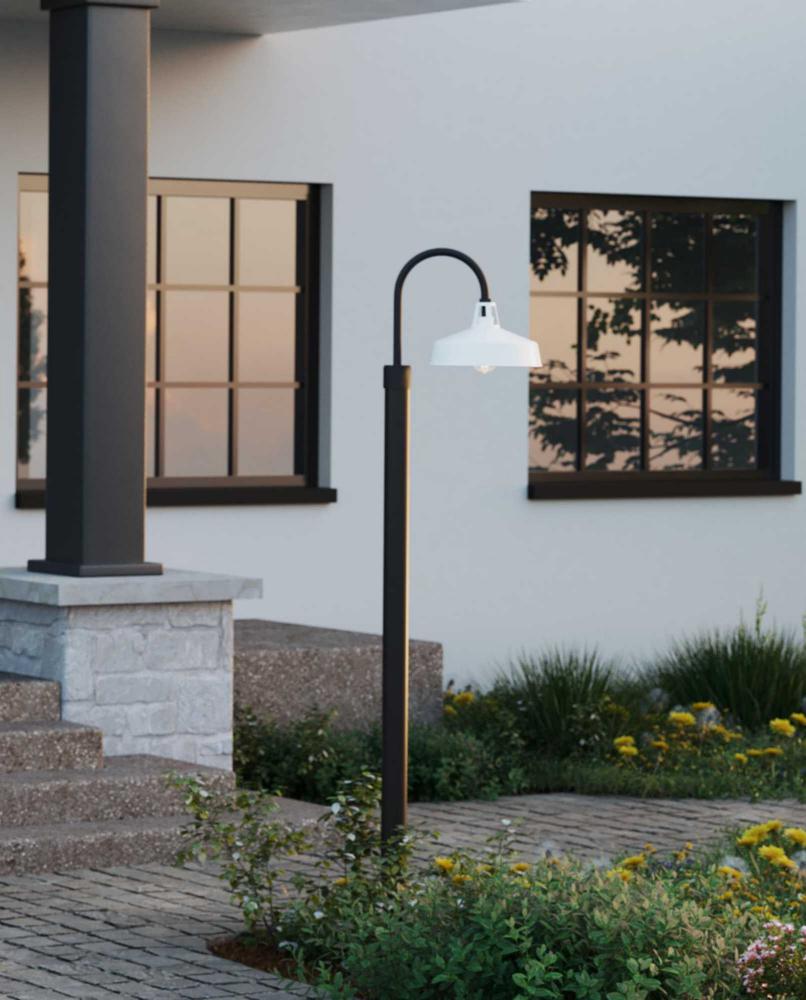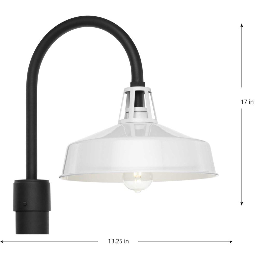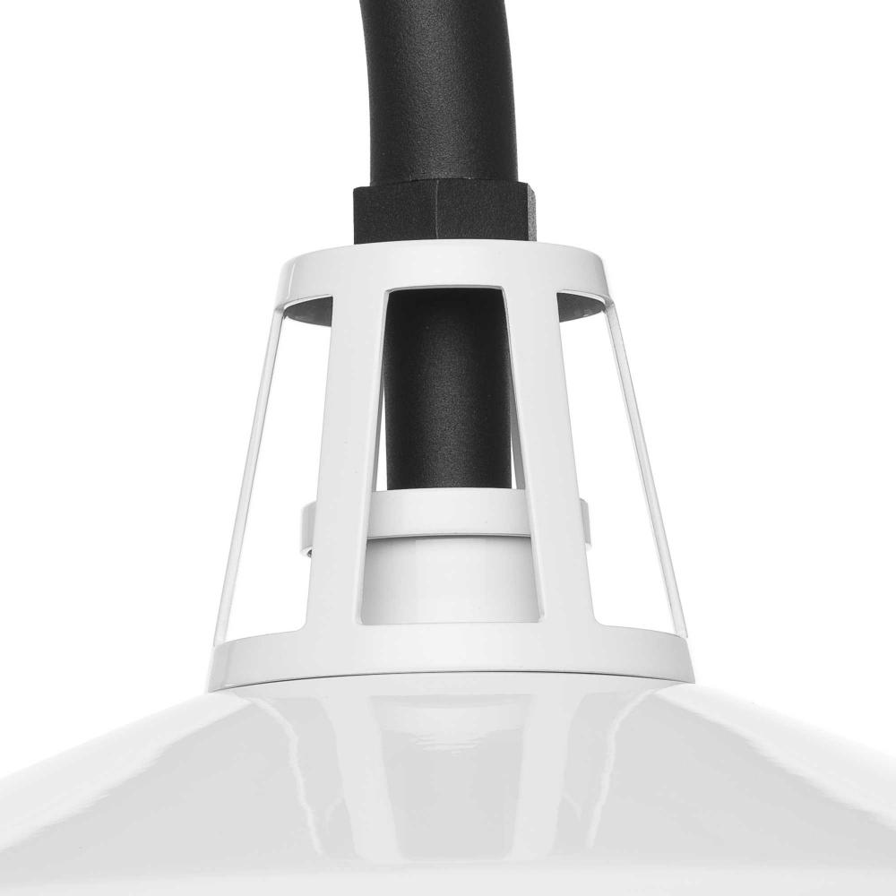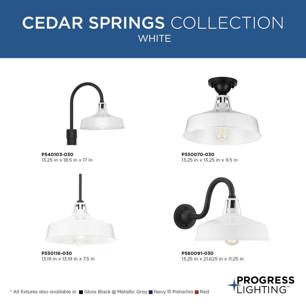 A fun take on the traditional warehouse shade, Cedar Springs can be a stylish addition to any indoor or outdoor space. Offered in a generous size and featuring a black gooseneck arm style and white shade, this classic Farmhouse fixture serves as an eye-catching addition to a variety of facades. Dark Sky Friendly.