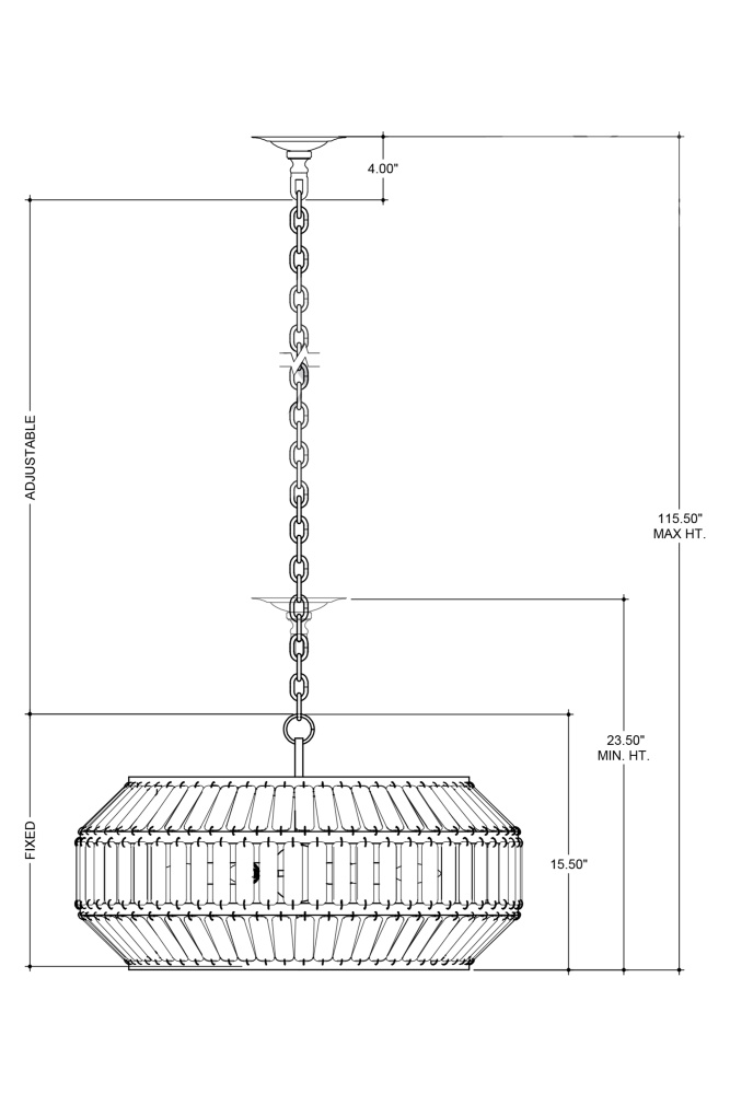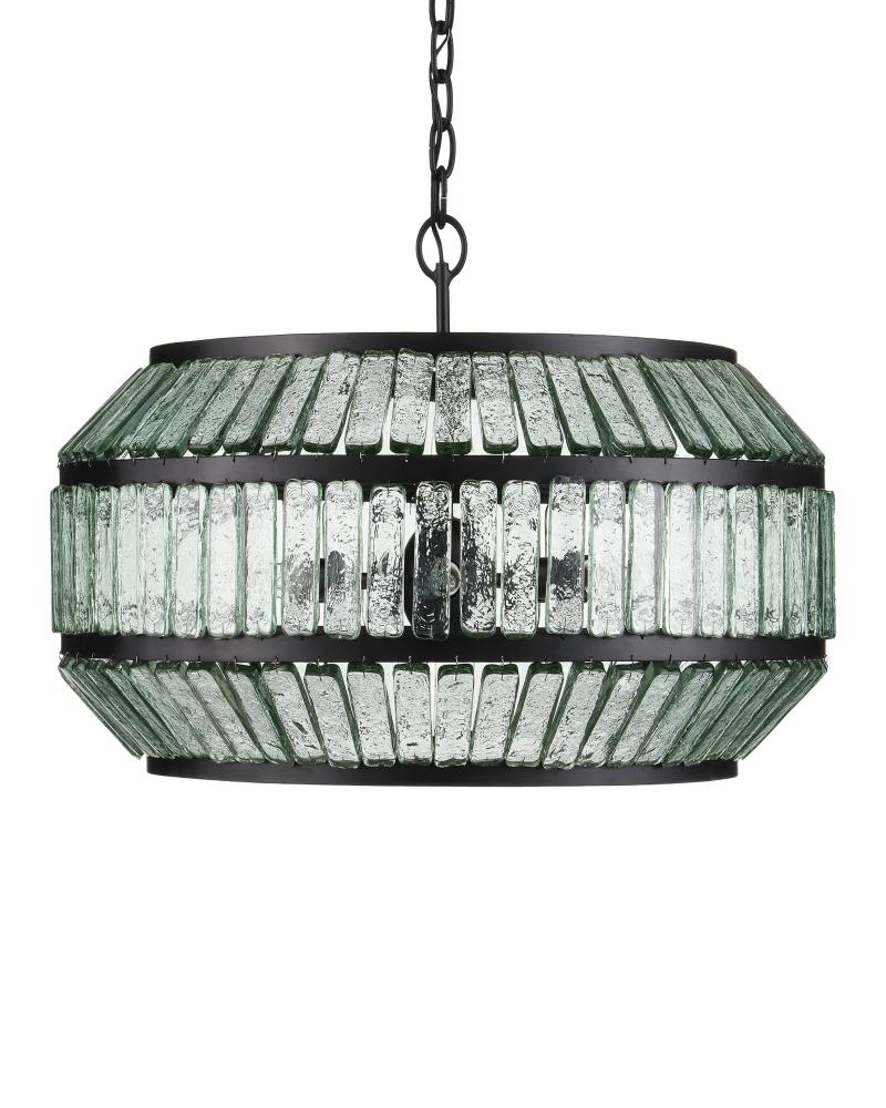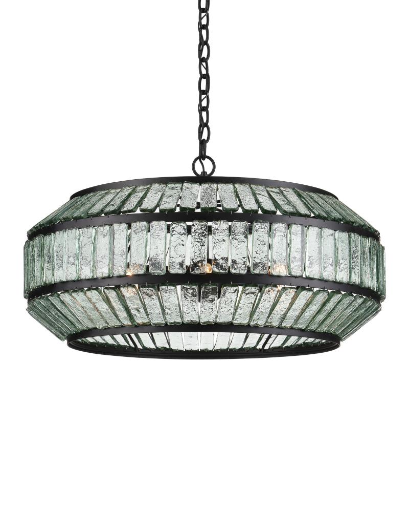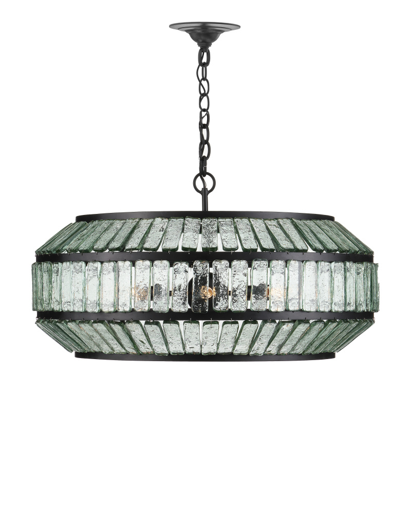 The Centurion Chandelier has elongated recycled glass panes that are unobtrusively fitted into wrought iron rings in a satin black finish. The thinness of the wire that fastens them makes this design feel streamlined and the wavy surfaces of the pieces of glass make it luminous. This black chandelier is stylistically suited to modern farmhouse, traditional, and transitional interiors. Adjustable from 23.5" to 115.5" with use of included chain/rod kit/cable. If your space calls for a longer drop, additional chain/rods/cable is available for purchase.