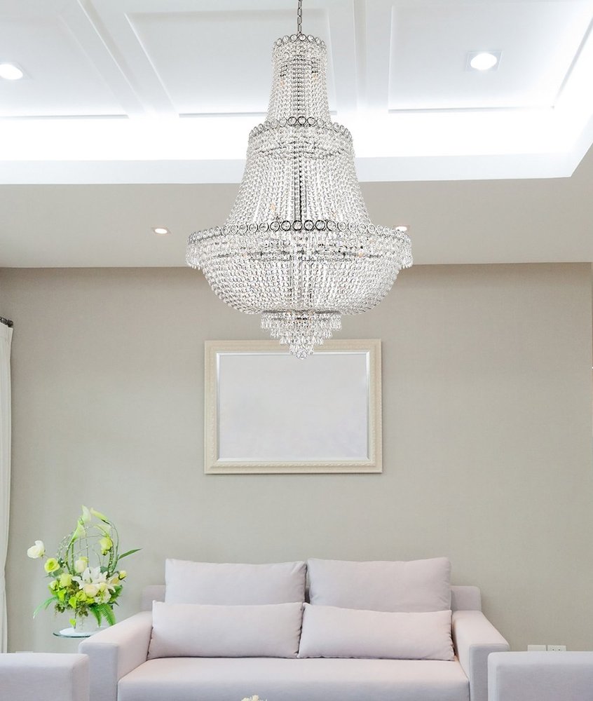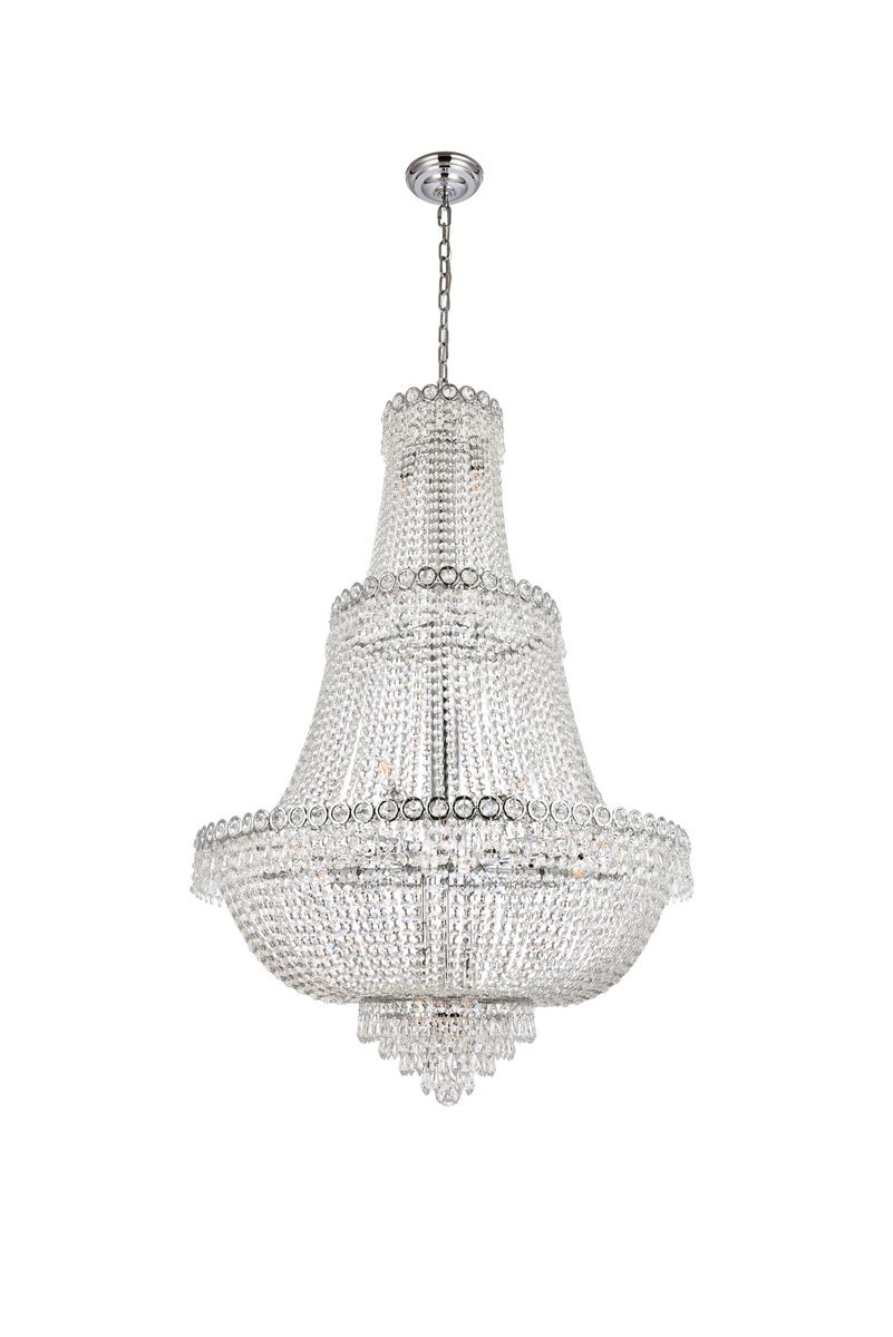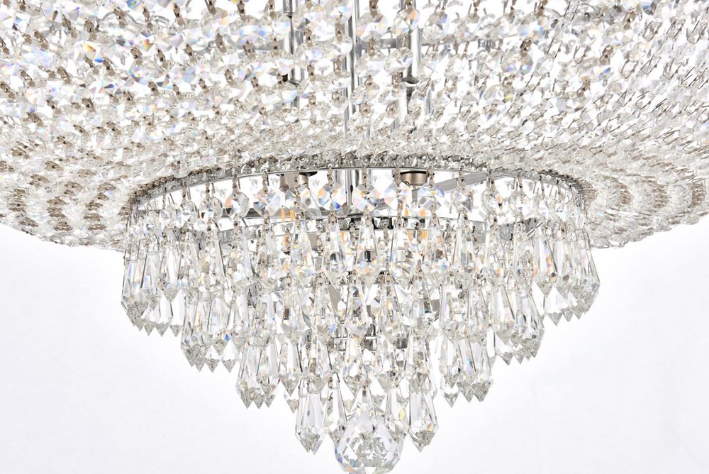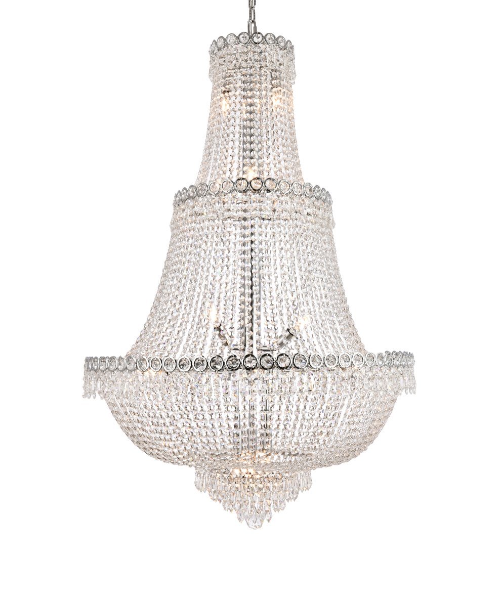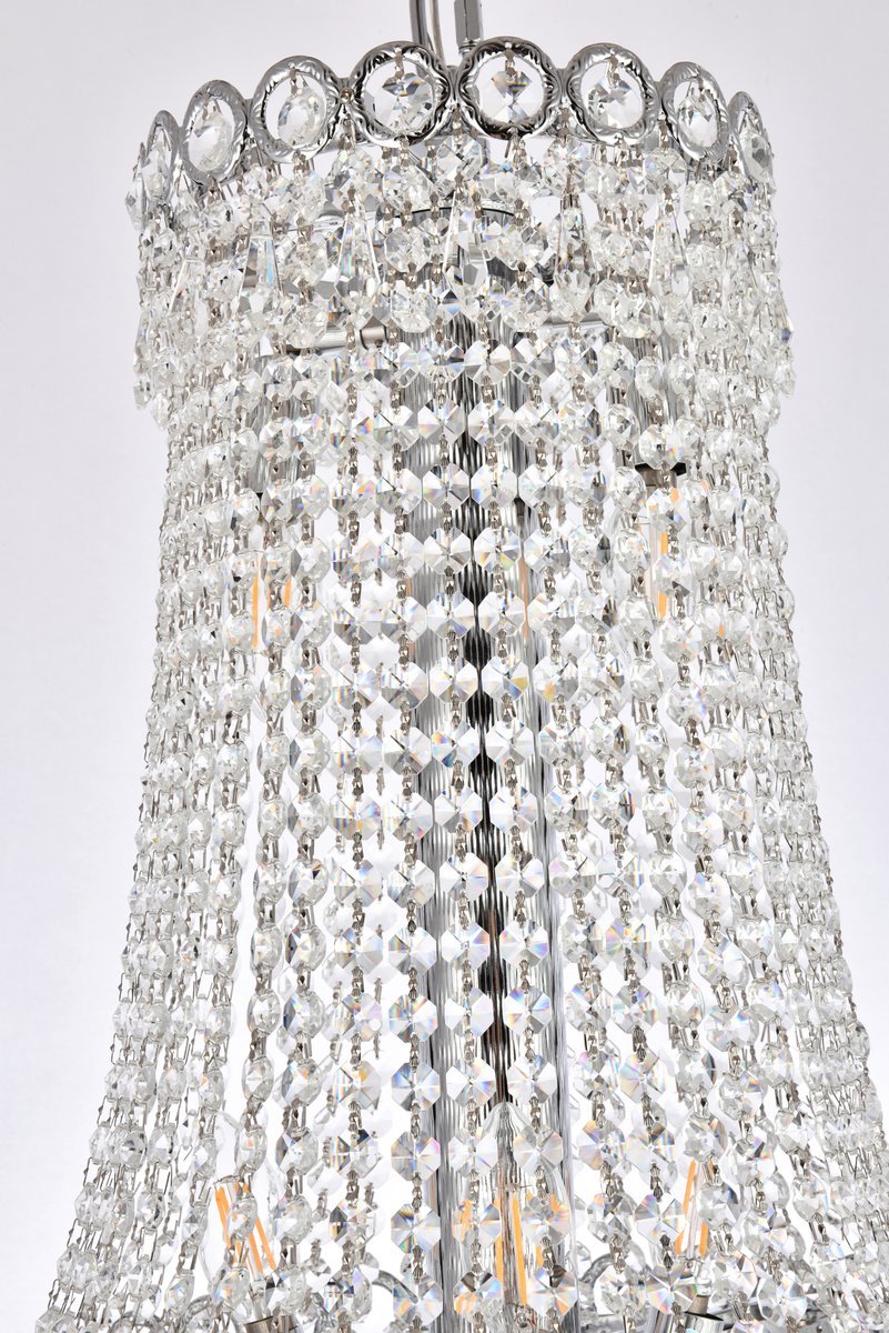 The exquisite Century collection was inspired by the classic allure of 19th-century France. These opulent chandeliers and pendant lamps are highlighted by delicate lines of light-refracting crystals gently flowing down into a bell shape. Each layer is banded with crystal octagons and spear-shaped drops, with the extravaganza coming together at the bottom with a Single crystal ball or a shell completely covered in clear spherical crystal balls. This masterpiece is available in a variety of crystal trims. A column of chrome or gold inside supports soft-glowing candelabra bulbs, creating an effulgence that peeks out between the strands of crystals.