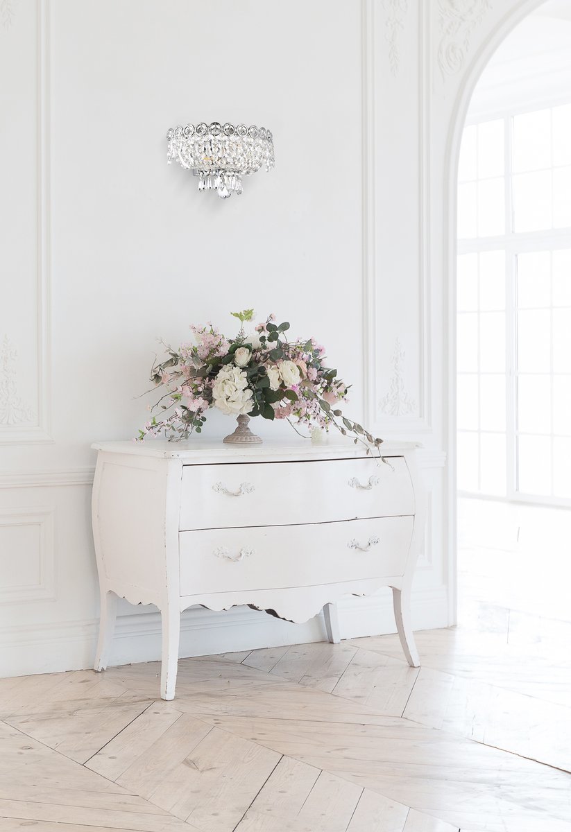 This 19th-century french-inspired sconce showcases royal-cut clear crystals in a bottom hemisphere shape, refracting the light from within