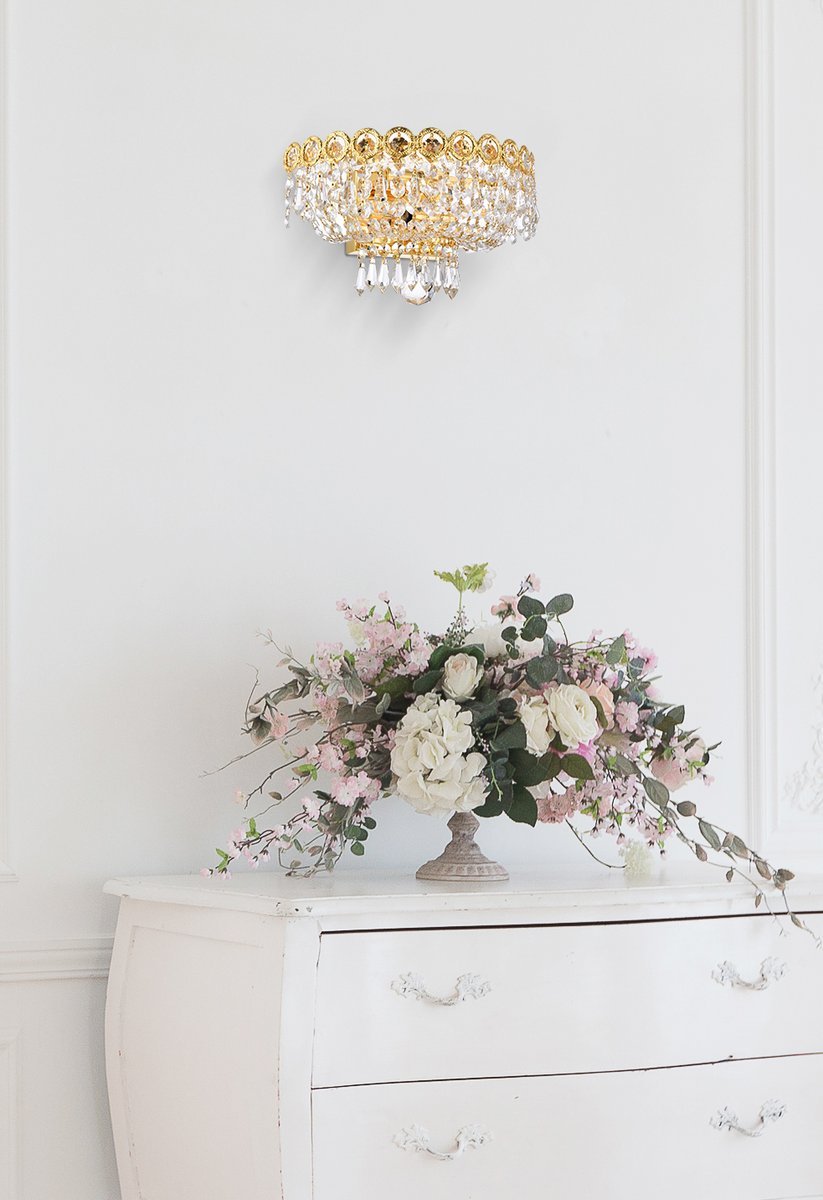 The Century collection brings a touch of 19th-century French elegance to your home. Choose wall sconces in either a bell-shaped design or a bottom hemisphere shape, profusely covered in clear crystal octagons and prisms. Available in an array of crystal trims embellishing frames finished in gold or chrome.