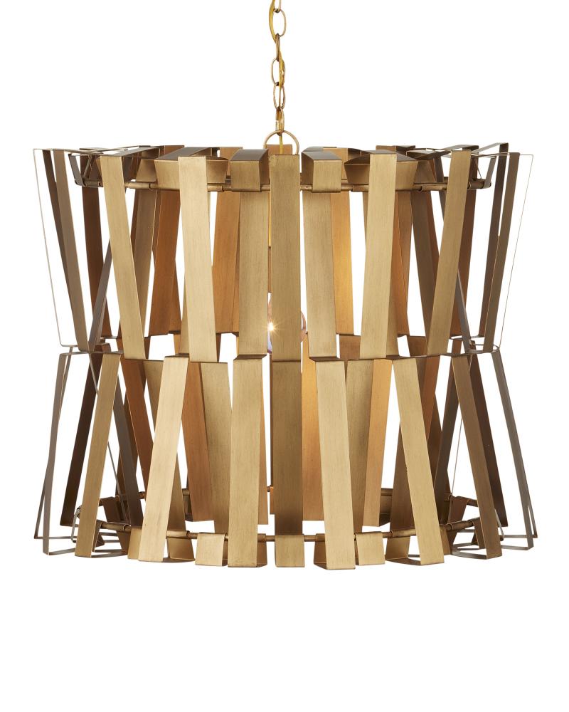 As complex as a profile gets, the Chaconne Brass Chandelier has a circumference ringed in folded metal straps. Each piece is bent seven times to achieve the shape that is then wrapped around the frame. This is a labor-intensive process that takes a tremendous amount of concentration to ensure that the interconnecting straps end up the exact same length. Brightening the overall composition is the brass finish. Adjustable from 28.5" to 96.5" with use of included chain/rod kit/cable. If your space calls for a longer drop, additional chain/rods/cable is available for purchase.