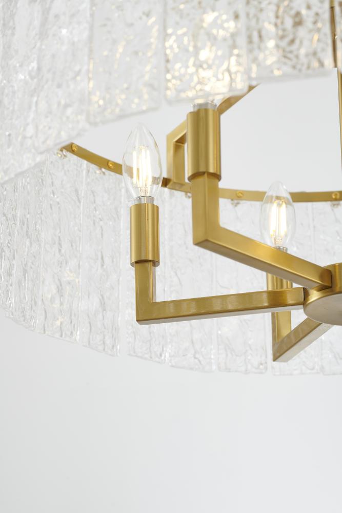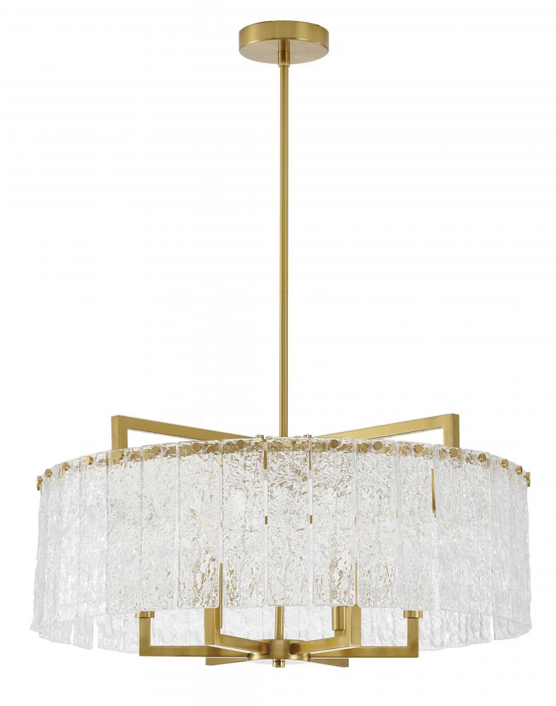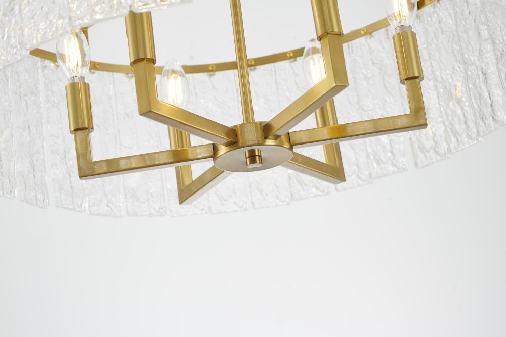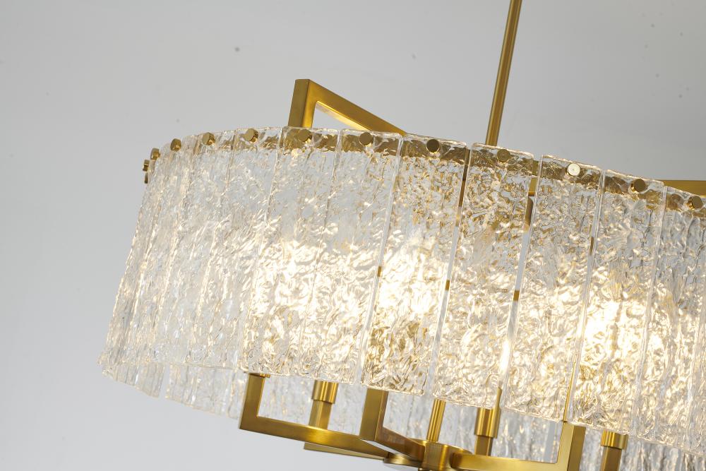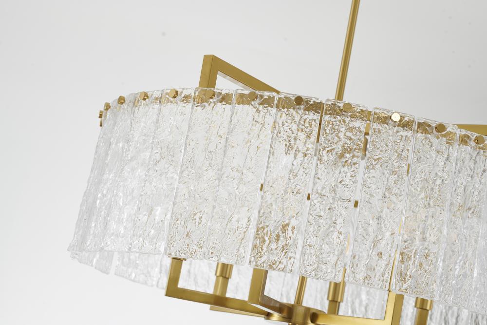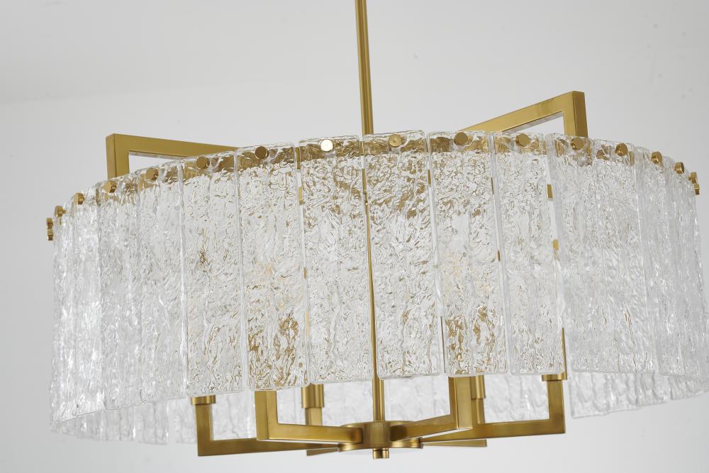 This chandelier is a round brass frame chandelier. It comes with clear hanging rippled glass. The rod lengths of 12" + 12" + 6" + 6" is provided and the rod length is adjustable.