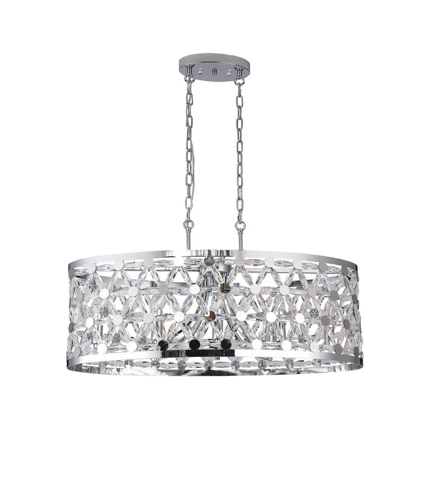This chandelier is in a chrome finish. The frame is made out of metal, and the shape of the frame is oval. It comes with crystal star detailing in clear color. You can create a timeless feel in any room while using modern forms.
