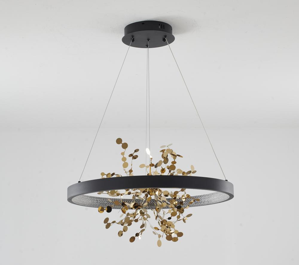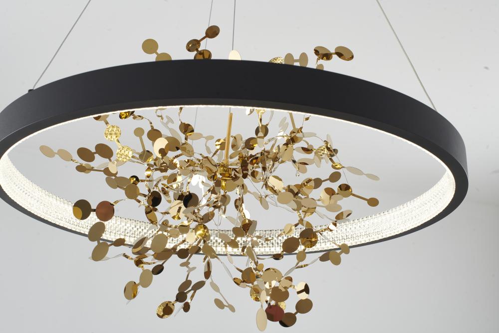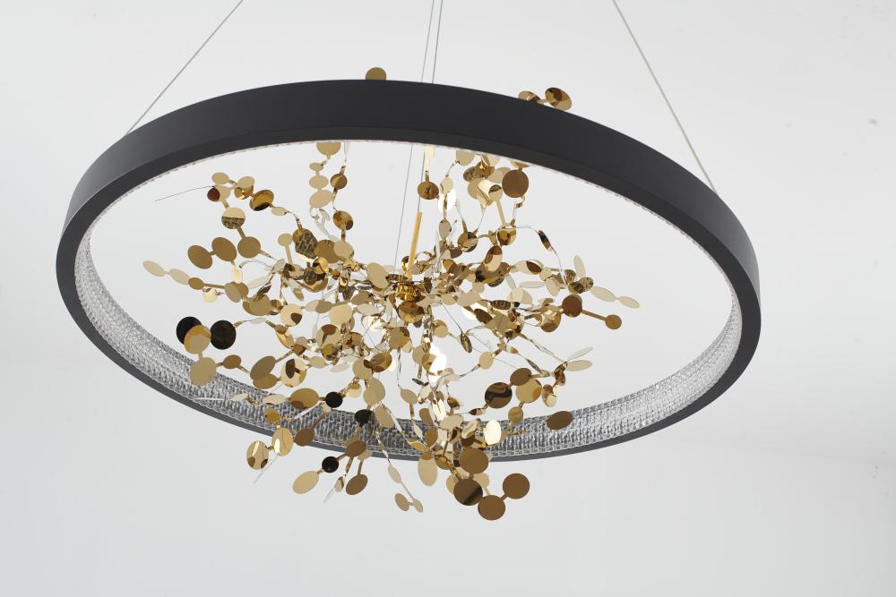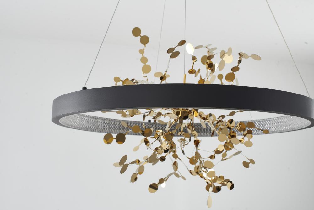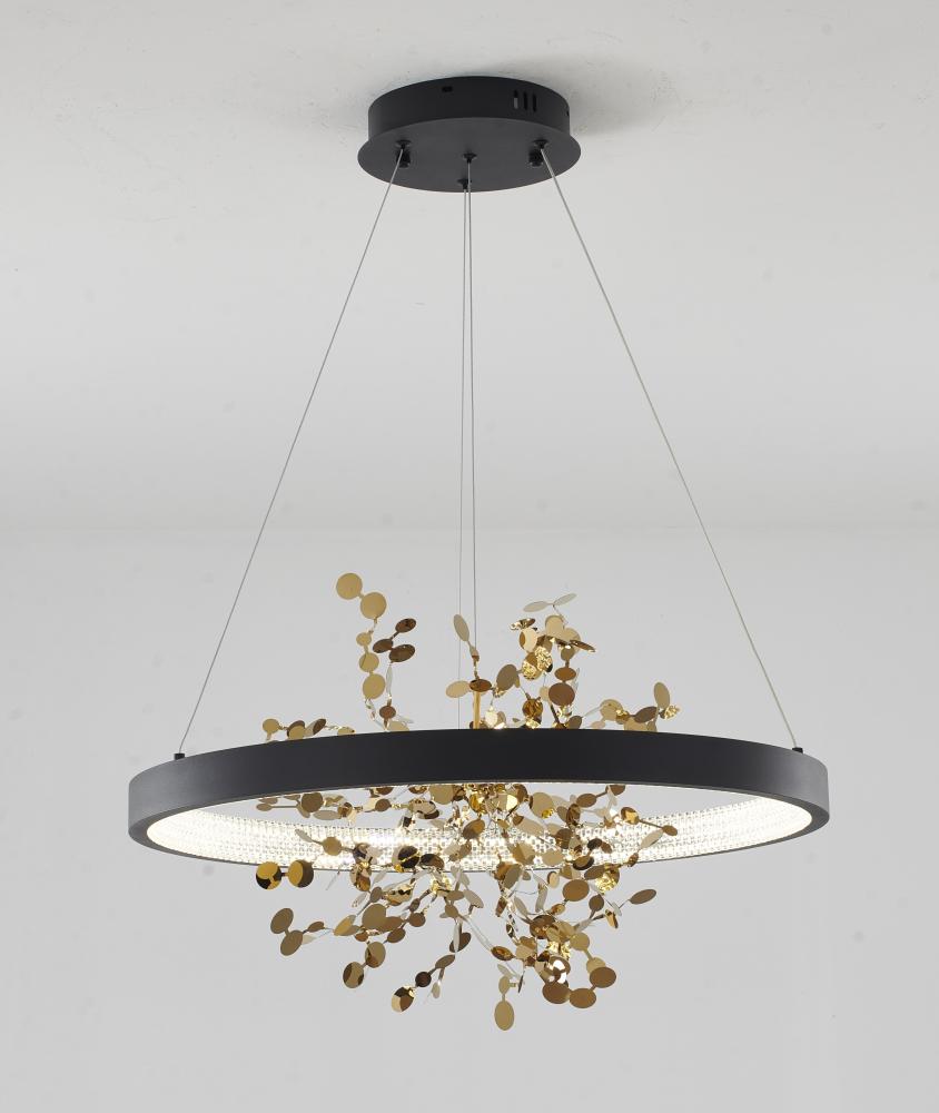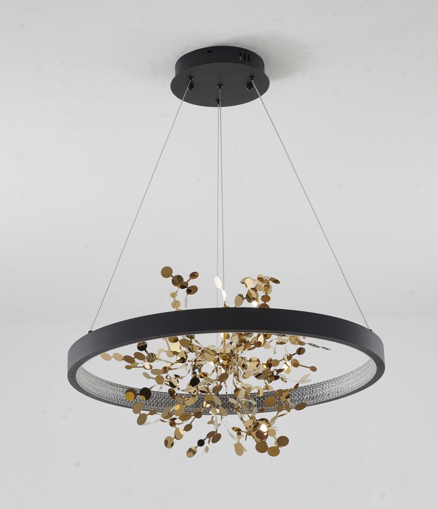 This chandelier is in a sand black finish. It comes with a gold stainless steel confetti interior and a transparent diffuser. The cord length of 78 inches is provided and the cord length is adjustable.