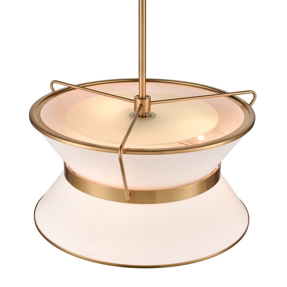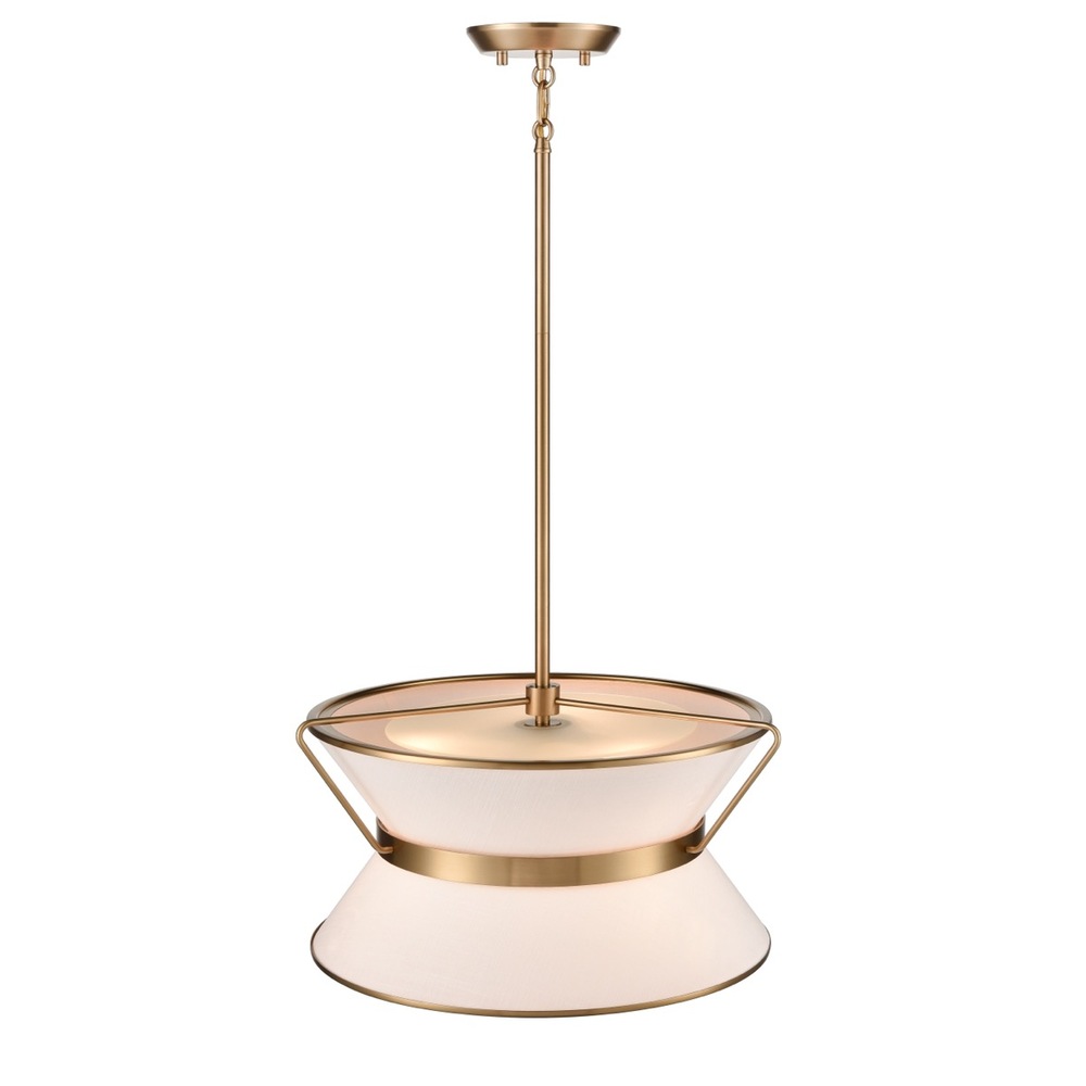 The Layla collection, designed by Kevin Kraemer, features a rich plated brushed brass finished frame, which holds the double linen shades in a unique fashion. The model shown is a single pendant chandelier measuring 17" diameter at its largest width. (23.5" diameter larger model also available). A stunning fixture for any kitchen or dining room.