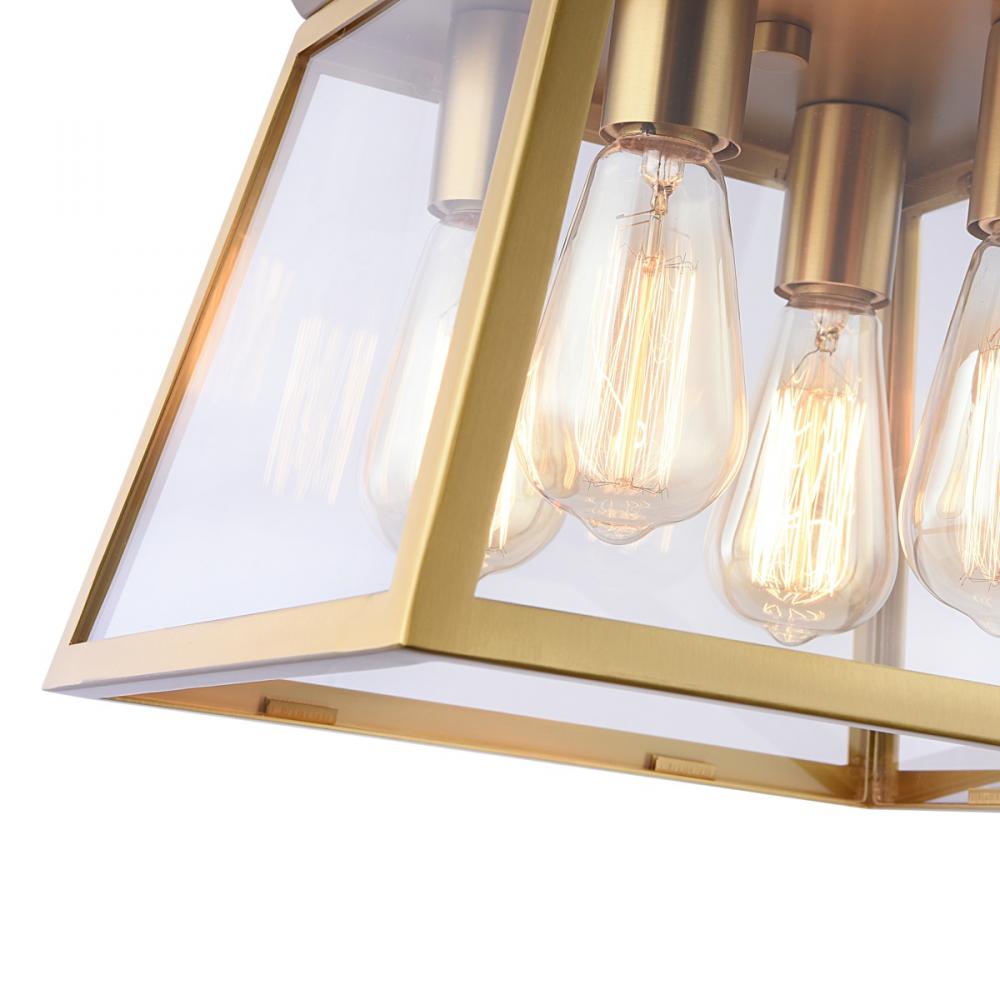 The Lucian collection, designed by Kevin Kraemer, is a modern twist on a classical lantern style light. Shown in a rich plated brushed brass (also available in black with brass accents). Clear panel glassware surrounding the bulbs. The model shown is a 4 light chandelier with a diameter of 12". (aslo available in a larger 18" diameter model) Great for any area of the home.