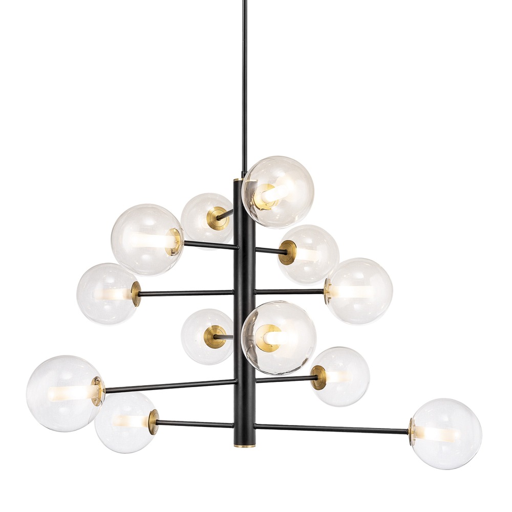 The Aurelia Collection is defined by its contemporary allure, featuring a black frame with brass accents. Each arm of the chandelier is adorned with beautiful spherical clear glassware, creating a visually striking contrast and emitting a soft, inviting illumination. This collection seamlessly marries sleek design with a warm aesthetic, making it a stylish and captivating addition to any space. 12 light chandelier shown. (height adjustable via extra rods included)