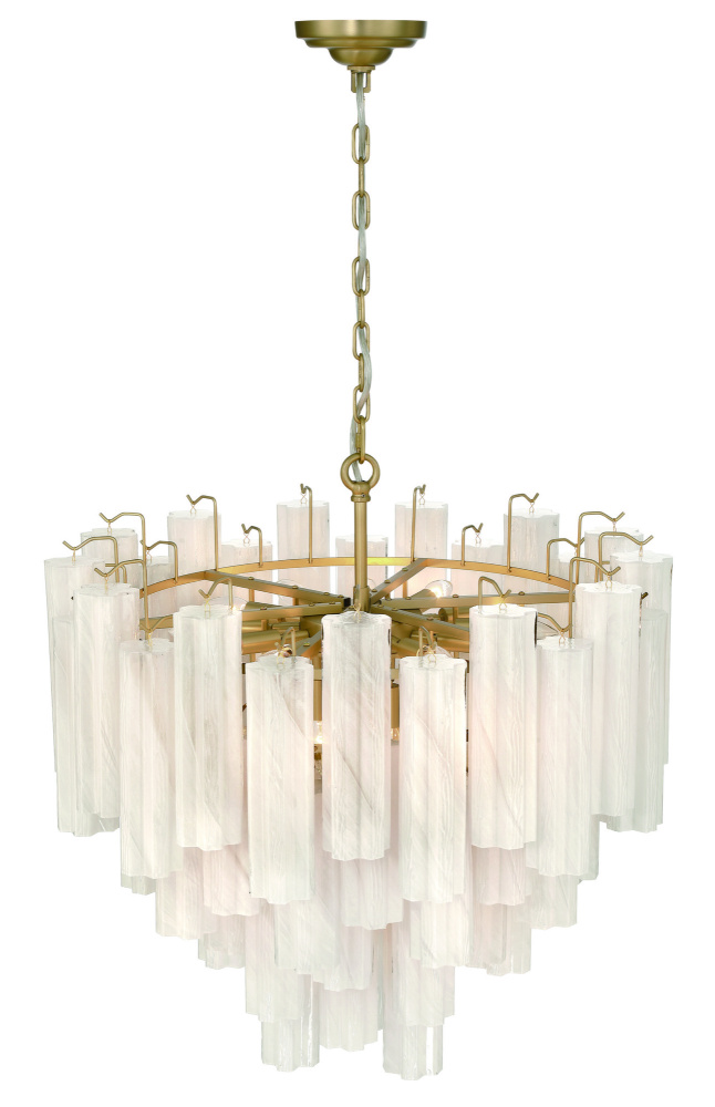 The large chandelier from the Sophia collection captivates with its cascading arrangement of ornate “Tronchi” style Wispy White glassware, reminiscent of shimmering icicles. Each glass element delicately refracts light, creating an enchanting glow, while the warm brass frame provides a refined contrast, evoking a sense of luxury. Perfect for classic and modern interiors alike, this design transforms any space into a haven of timeless beauty.