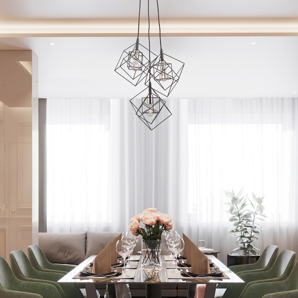 Geometric in design the Artistry collection is meets the transitional type décor criteria. The outer frame is matte black and the interior is plated in polished nickel. Triple pendant shown. (Also available with harvest brass interior)