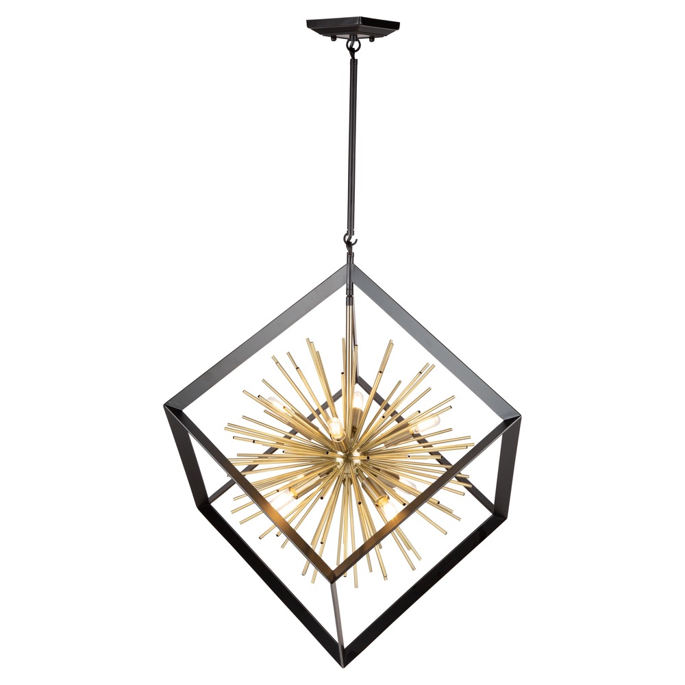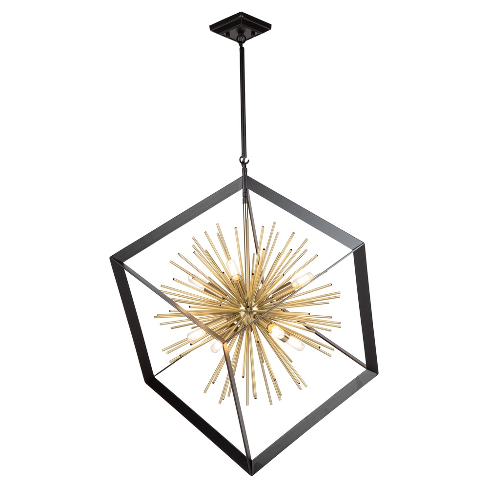 The Sunburst Collection chandelier is unique and a definitely beautiful focal point. The exterior frame is matte black encasing a satin brass cluster of thin hollow rods. (Larger size and flush mount also available)