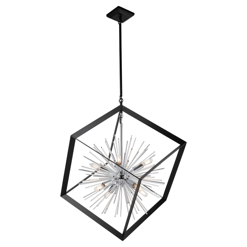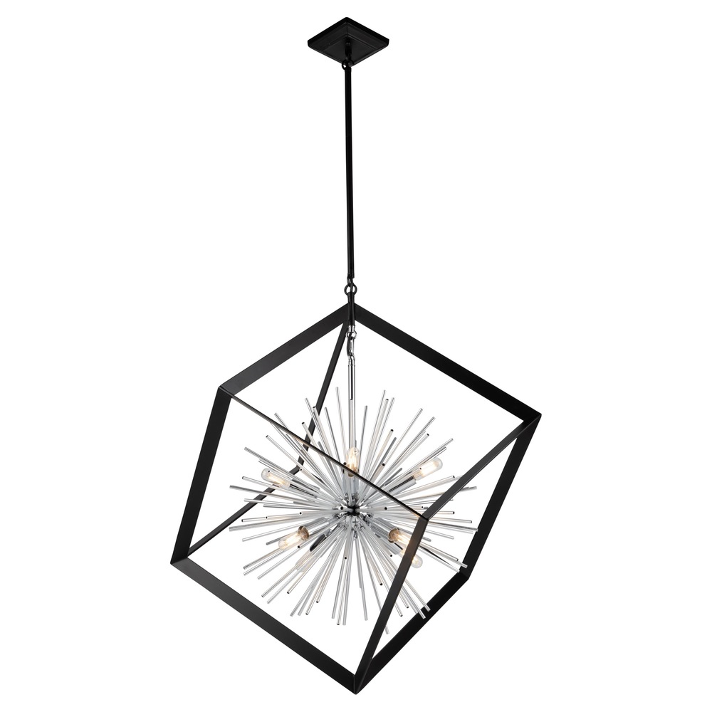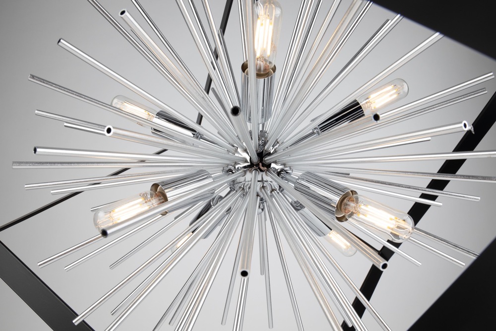 The Sunburst Collection 8 light chandelier is unique and a definitely beautiful focal point. The exterior frame is matte black encasing aluminum color thin hollow rods attached to a chrome center. (also available with satin brass interior cluster).