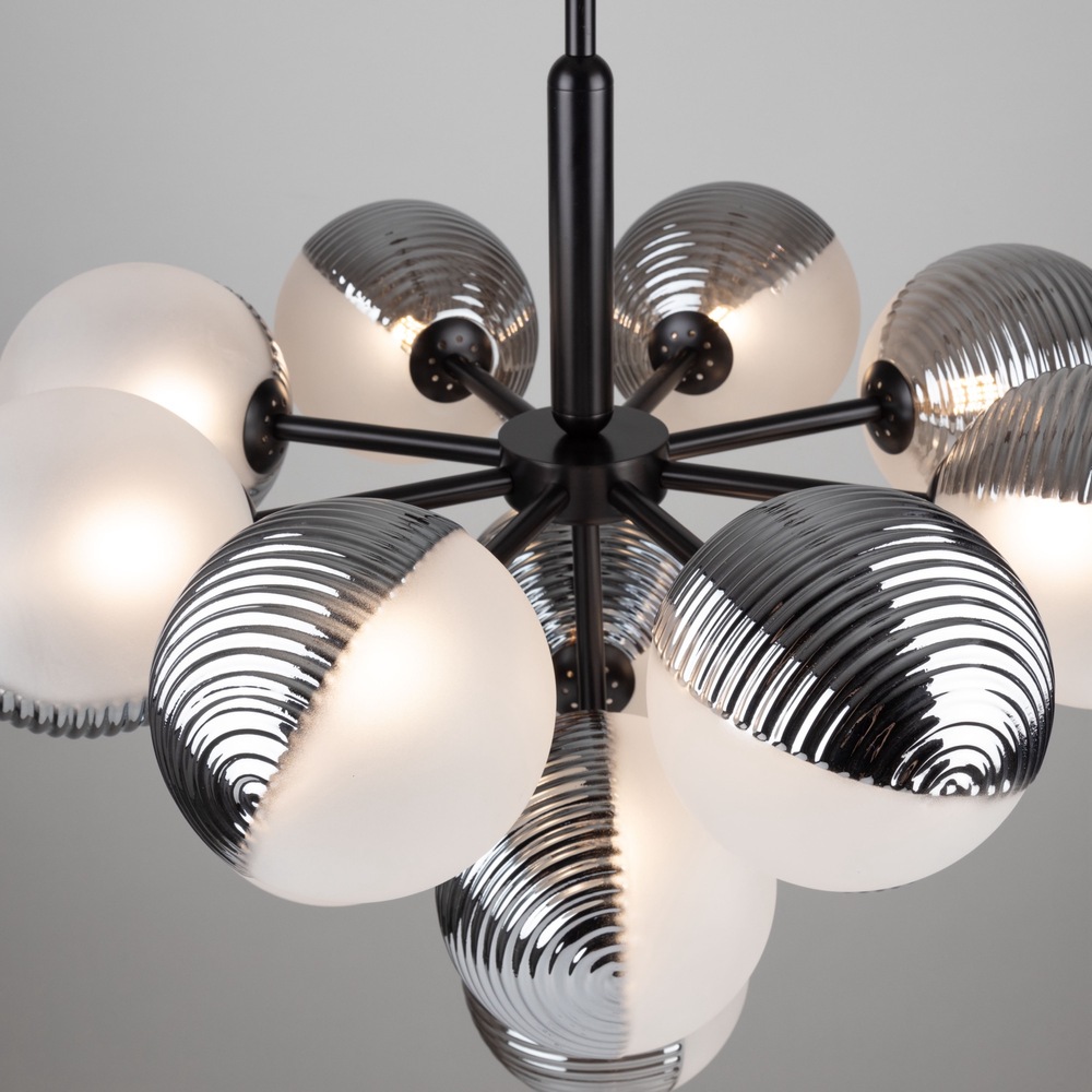 The Bolla Collection radiates unique allure through its innovative design, seamlessly combining half-acid white and half-ribbed smoke glass spheres. The chandelier's interplay of textures and tones establishes a visually striking focal point, effortlessly merging contemporary aesthetics with enduring charm. This unique glassware is complimented with a semi gloss black frame. Single light wall sconce shown. 13 light 3 tier chandelier shown. (height adjustable with rods and built in hangstraight for sloped ceilings)