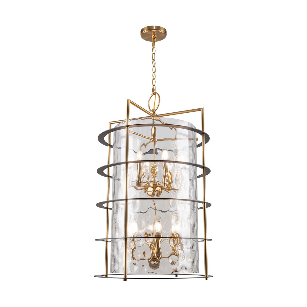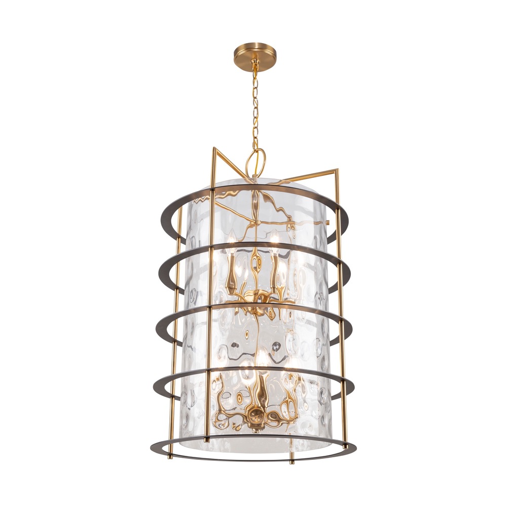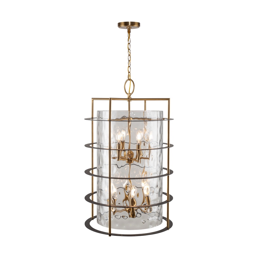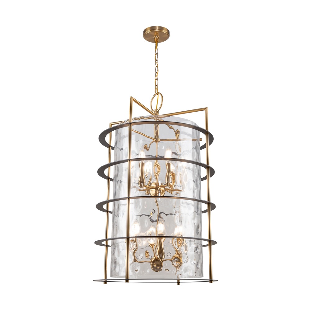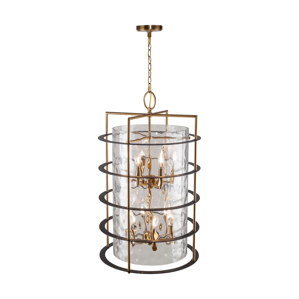 The Buford Collection is a striking ensemble that seamlessly blends elegance and modern design. Its defining features include a brass frame complimented with black rings, creating a contemporary contrast against the timeless appeal of the metal. The thick semi-transparent water glass add opulence and warmth, making these lanterns style chandeliers a sophisticated focal point for any space. 12 light lantern style chandelier for entrance, staircase, or foyer (height adjustable and compatible with sloped ceilings).