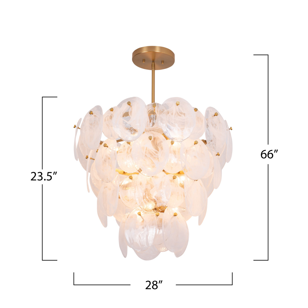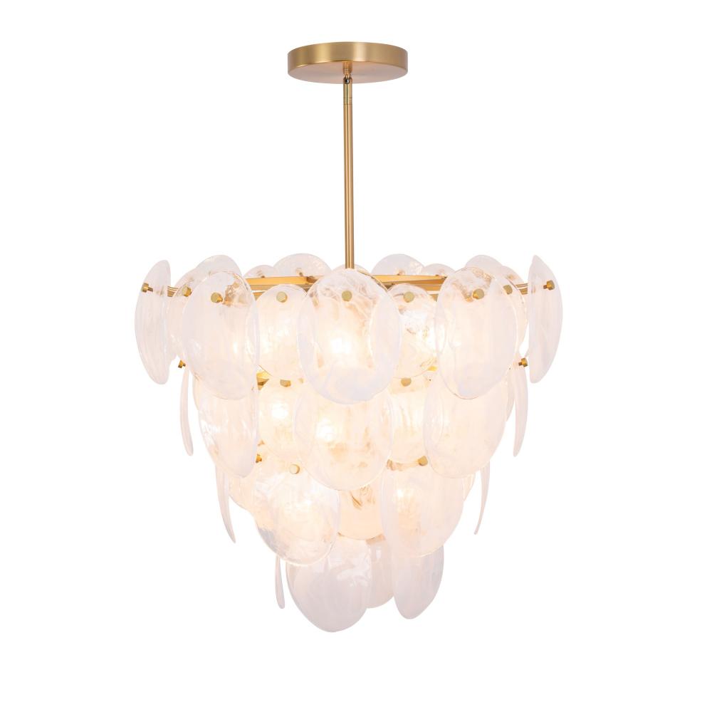 The Lily Collection exudes a delicate charm, captivating with its Murano-style glasswork in a wispy white finish. Each circular panel dances with subtle elegance, reflecting light in a manner that feels both luxurious and inviting. Complemented by a brushed brass frame, the design radiates a poetic blend of elegance and allure. This chandelier casts a spell of enchantment, illuminating your space with a touch of dreamy opulence.