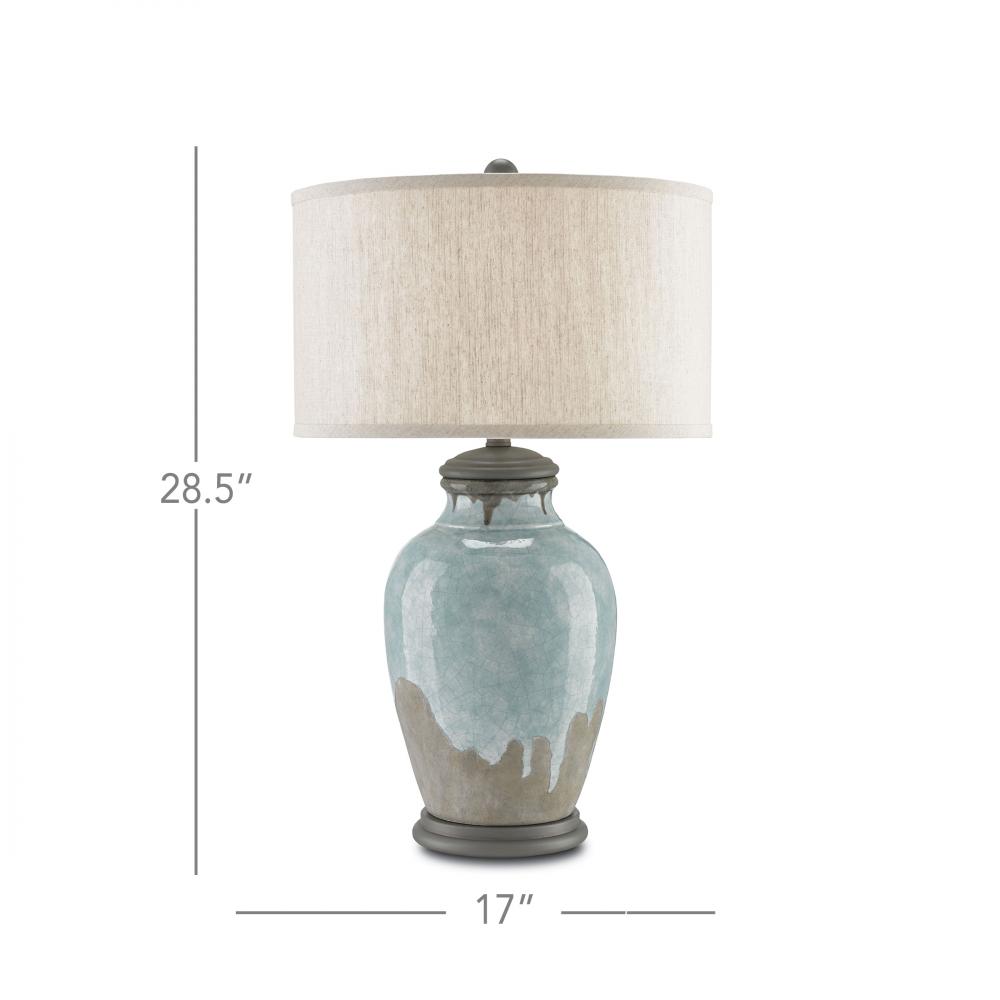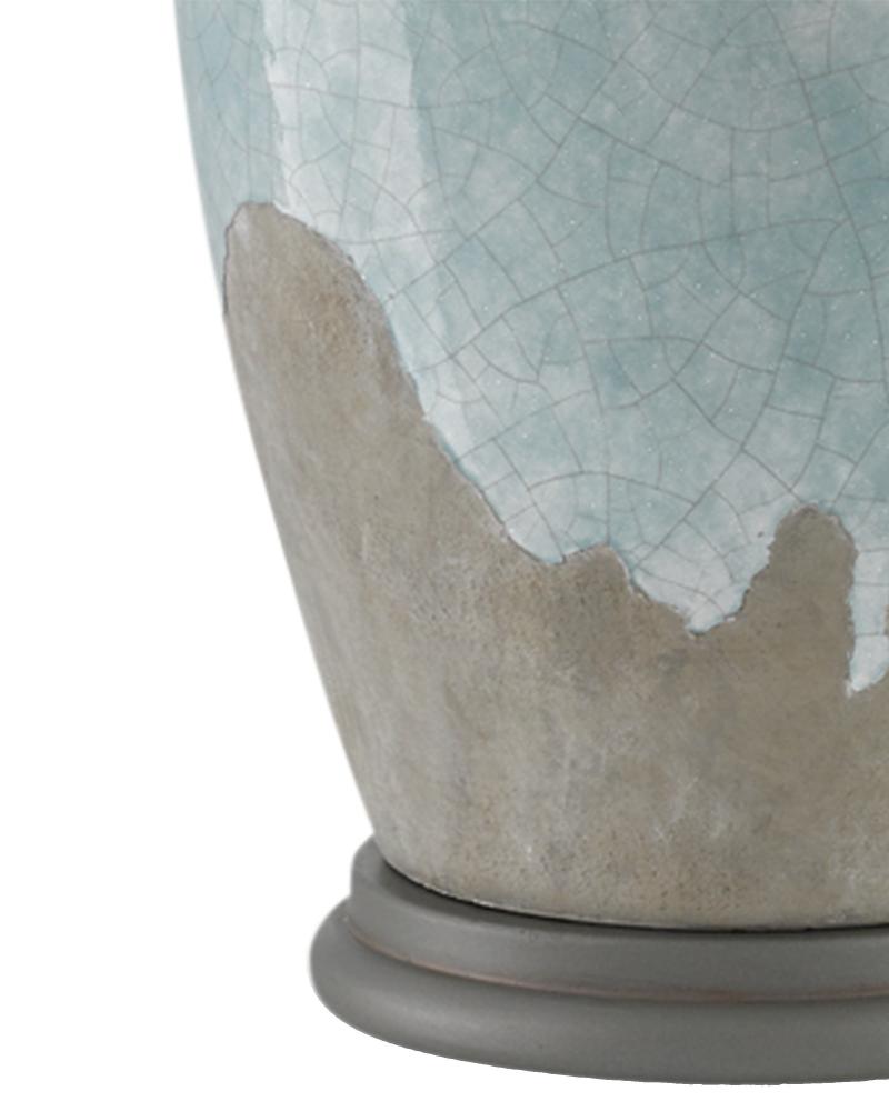 The pale blue glaze on the Chatswood Table Lamp flows over the gray surface of unglazed terracotta to bring it a handmade look. Wood accents in a Hiroshi Gray finish and the crackle finish on the ginger-jar shape brings the terracotta lamp, which is topped with an oatmeal linen shade, added texture.