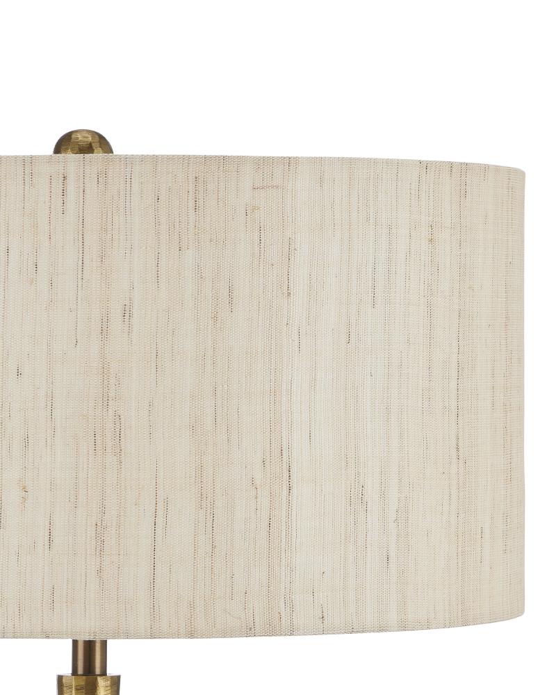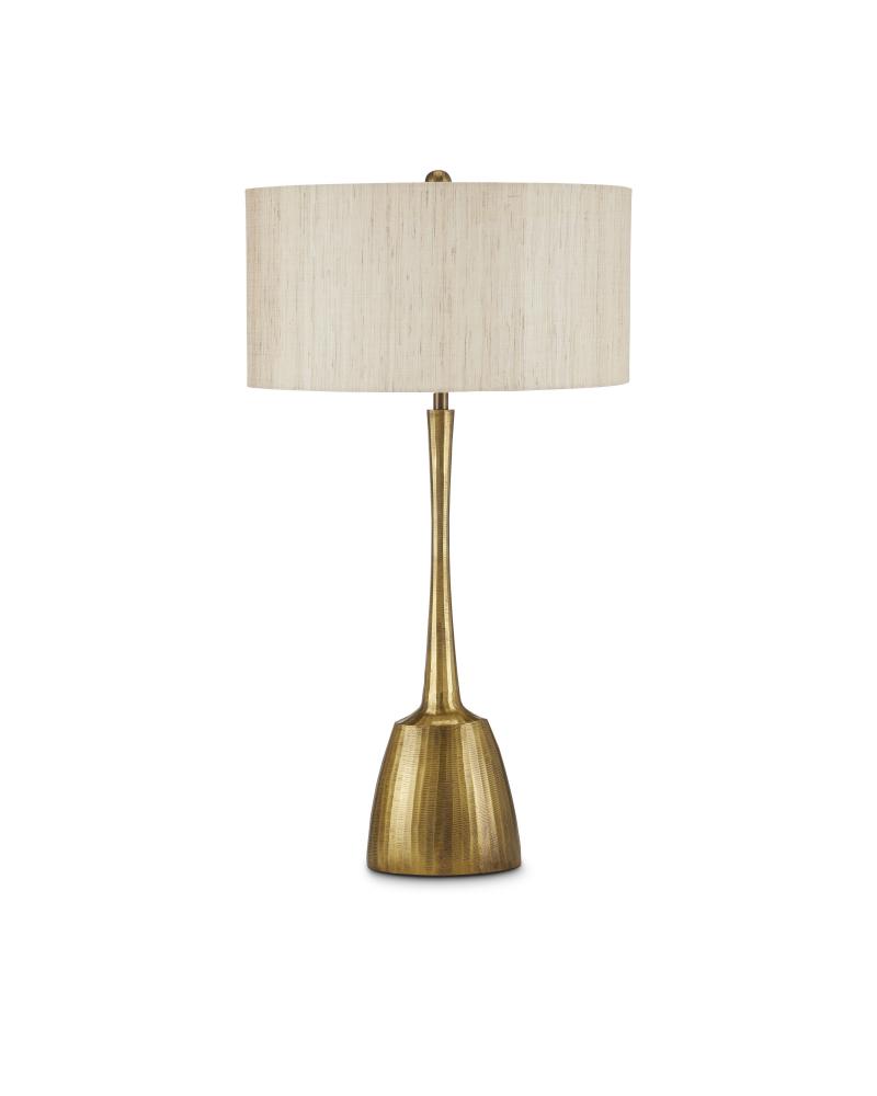 A nod to brutalist style with a gleaming antique brass finish, the Cheenee Table Lamp has a powerful silhouette. The gold table lamp has a long neck that subtly narrows in the middle, and the entire composition is striated with chisle marks in between the lines to bring added texture to the sculptural profile. Adding to this is the natural linen shade with its subtle striations.