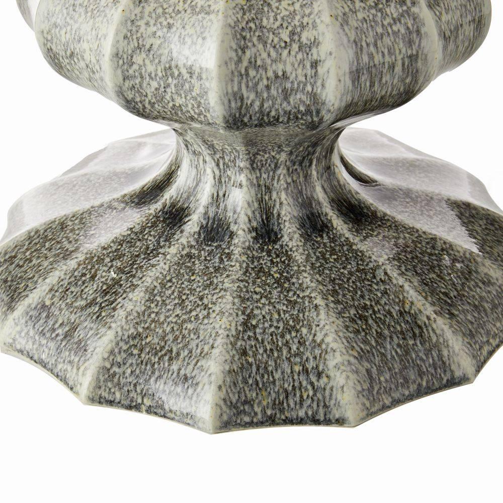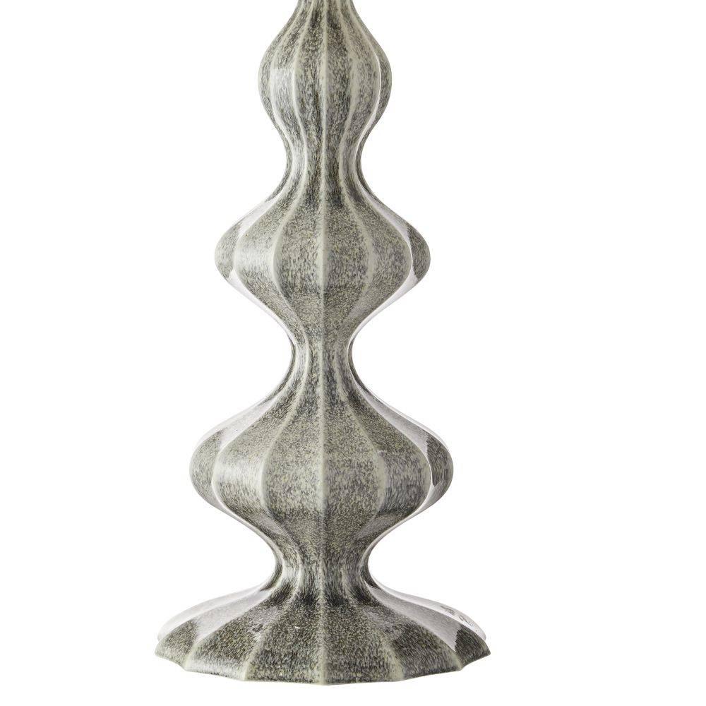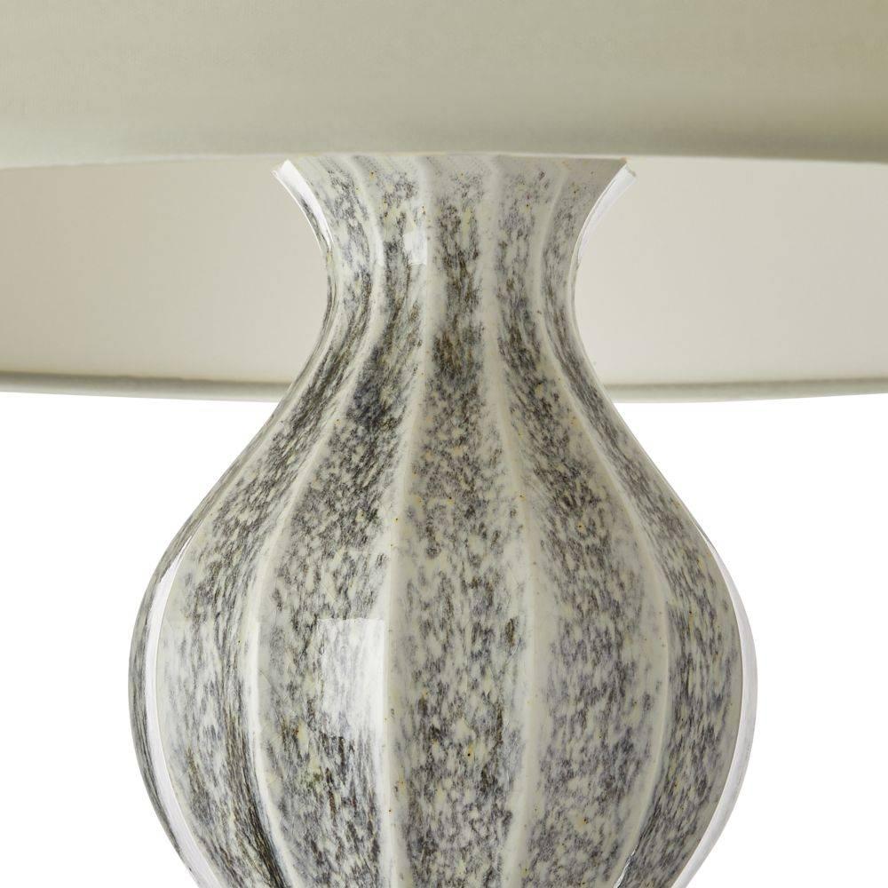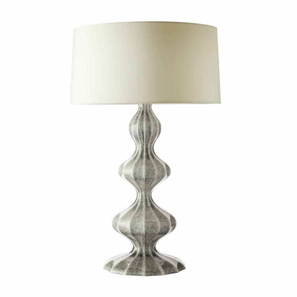 Like flowing waves, the lines of our porcelain squiggle lamp are enhanced by an ice reactive glaze that mimics water rushing down. Mutable shades accent each refined ridge at its pinch point. This porcelain essential is topped with antique brass hardware and an oval shade of ivory microfiber. Finish will vary.
