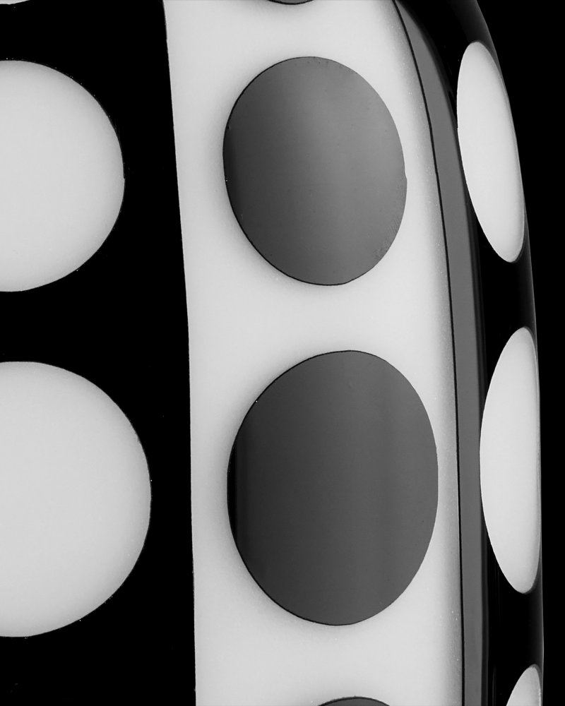 The Cicero Large Black & White Vase was created through an intensively complex process of layering clear, black, and white glass in that order. The dynamic profile with its mod geometric surface swirls with personality. Because the glass is layered on, there are slight raised areas that can be felt. This and the fact that the white layer of glass has to be sand-blasted away to reveal the black layer illustrates the artisanal quality of the white and black vase.