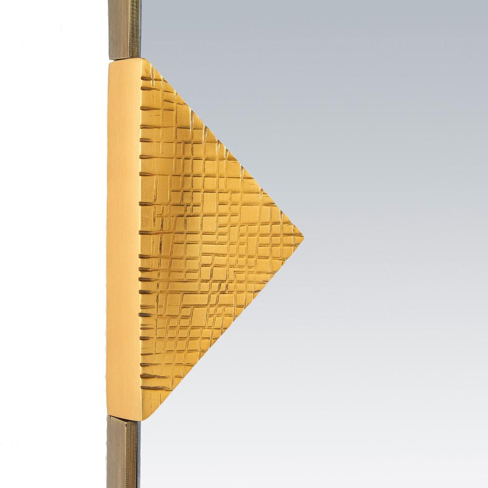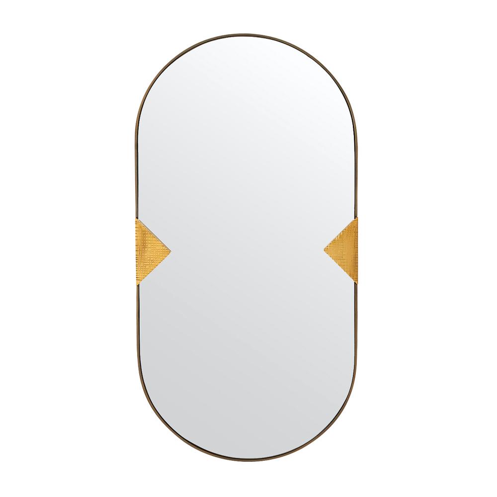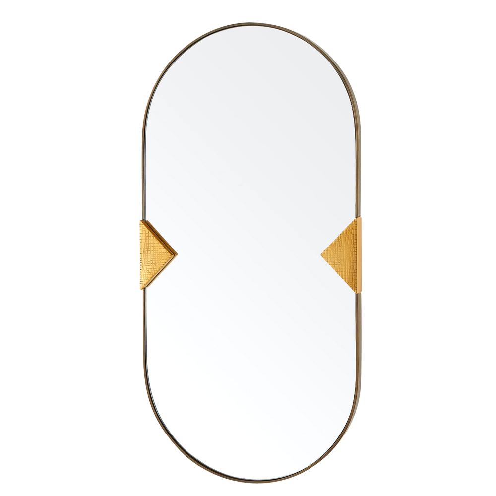 Dramatic clips of antique brass iron clasp an oval mirror like the setting of a diamond ring. Finished with a grid-like texture to recall forged armor, this dramatic piece can be hung horizontally or vertically. Cleat at the back for secure display.