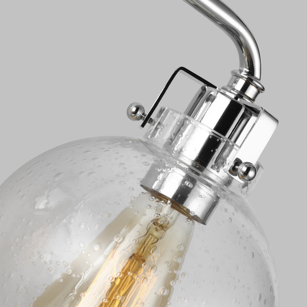 Clara features Clear Seeded glass shades that subtly diffuse the lamping while allowing the exposed bulb to be a central design element of the fixture. Choose the look that is right for your space with four finish options: Burnished Brass, Chrome, Satin Nickel, Oil Rubbed Bronze or a two-toned finish of Textured Black with Chrome.