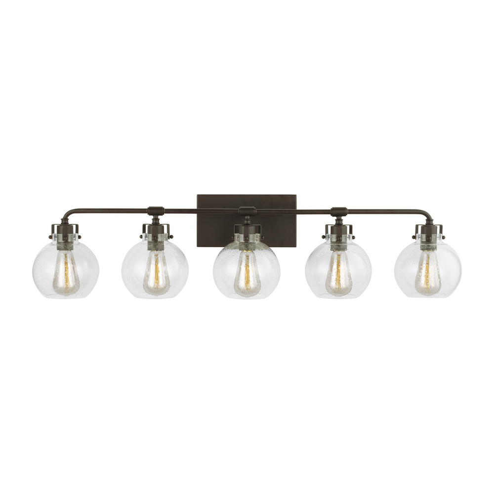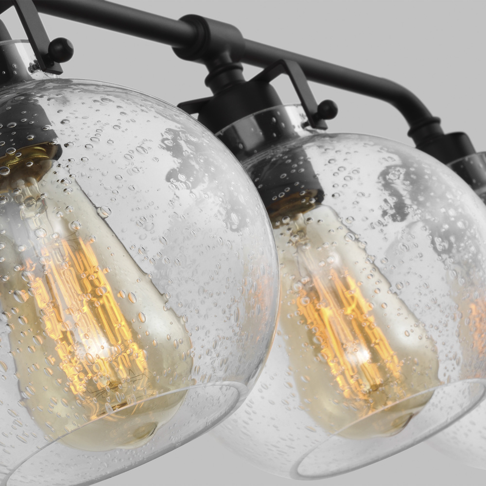 Clara features Clear Seeded glass shades that subtly diffuse the lamping while allowing the exposed bulb to be a central design element of the fixture. Choose the look that is right for your space with four finish options: Burnished Brass, Chrome, Satin Nickel, Oil Rubbed Bronze or a two-toned finish of Textured Black with Chrome.