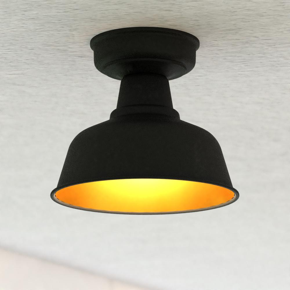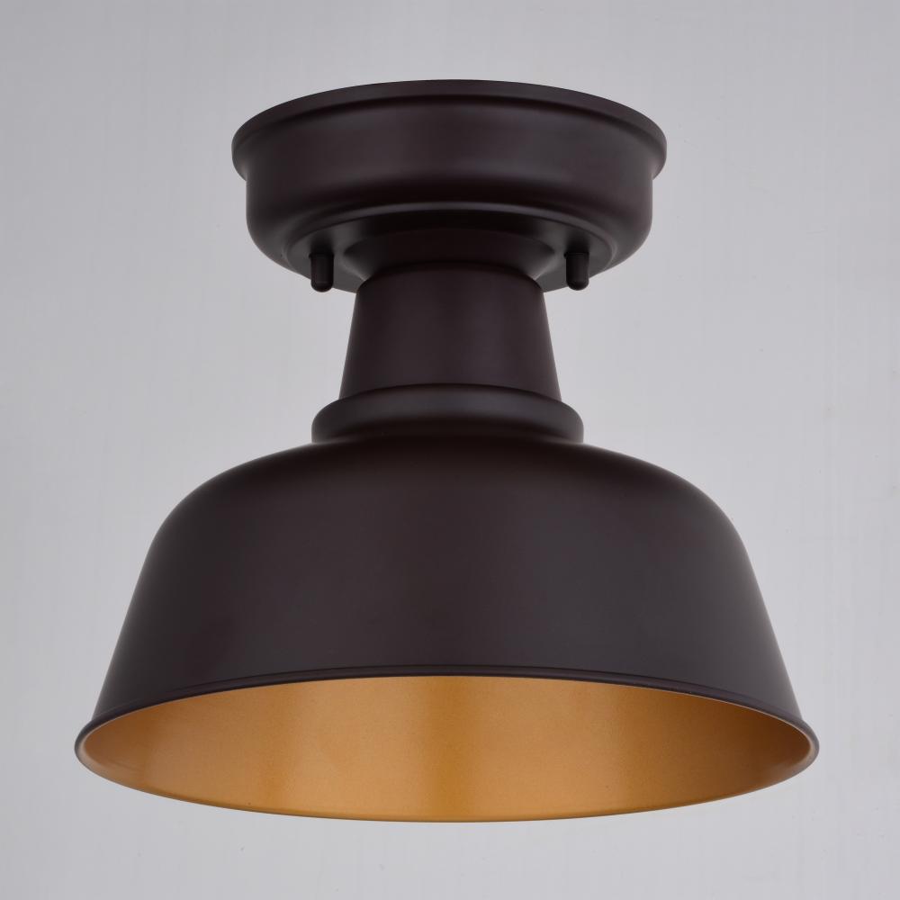 Bring farmhouse charm to your home's outdoor spaces with this updated classic semi-flush barn light. Its dark oil-rubbed bronze finish and light gold inner shade evoke a warm and inviting atmosphere. Perfect for your front porch, patio, vestibule, or any gathering space where you want to create a cozy ambiance.