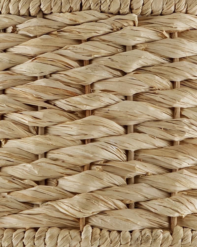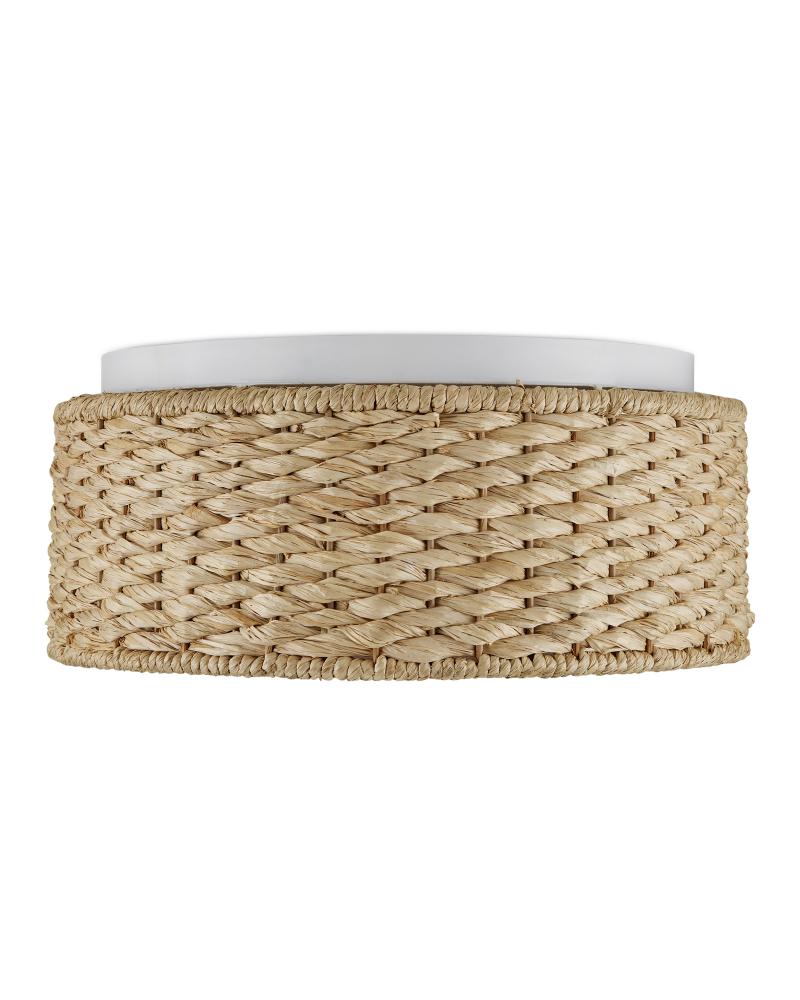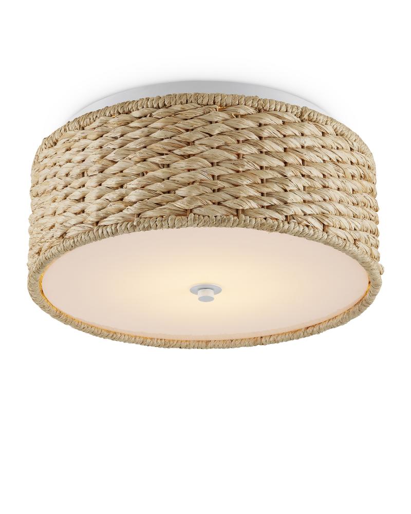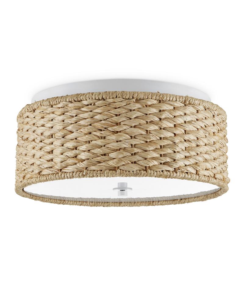 Raffia is densely woven around the circumference of the Colchester Flush Mount, creating a luminous design. Features that enhance the glow include the sugar white finish, the acrylic diffuser, the way the light flows onto the ceiling, and the weave that allows the light to seep through.