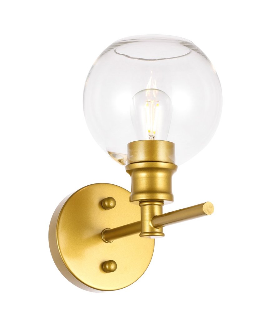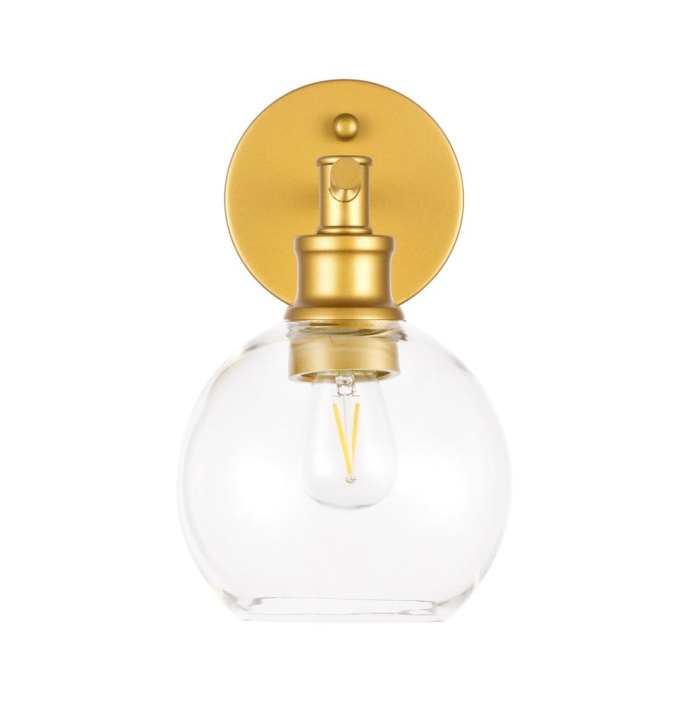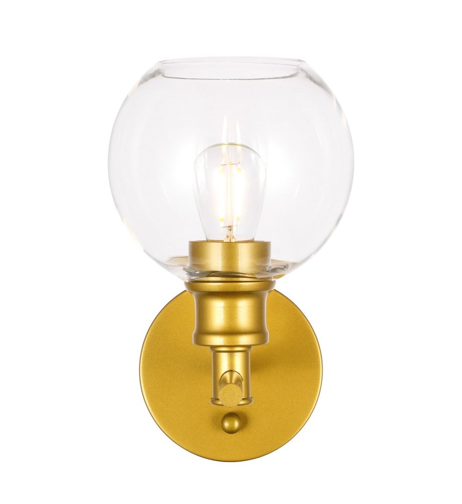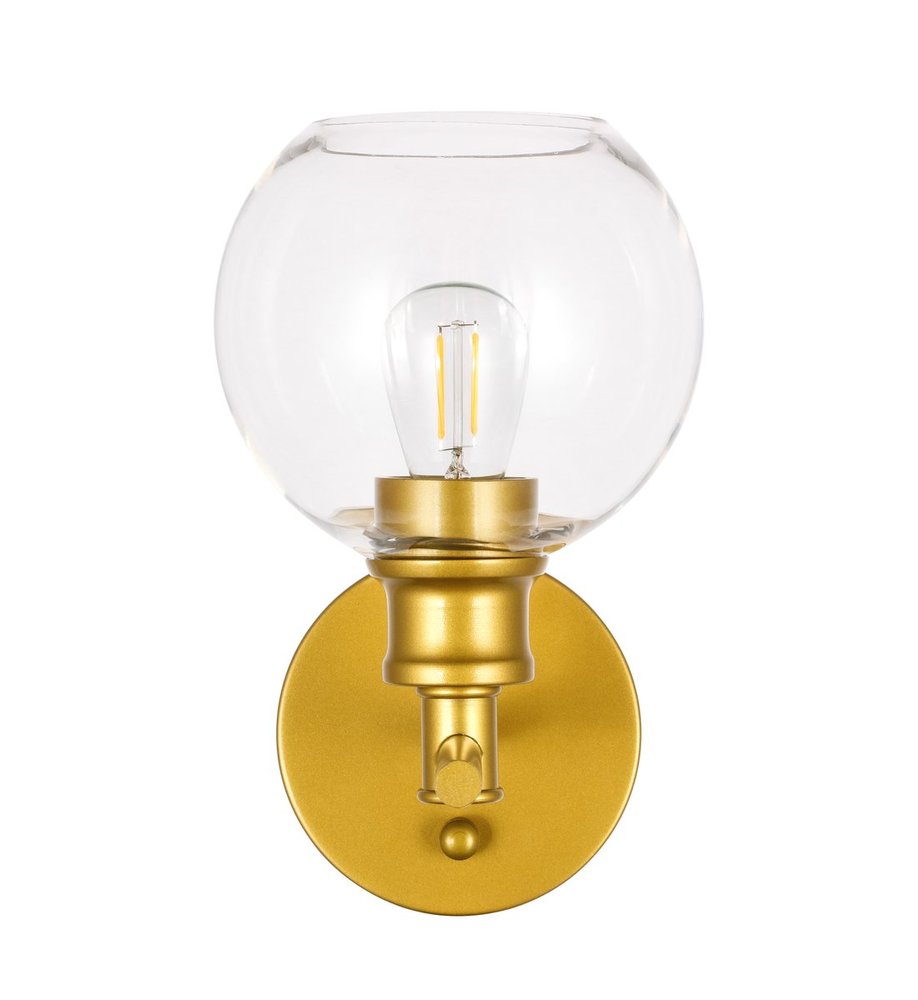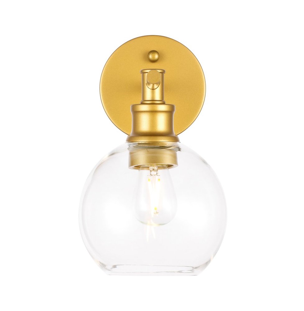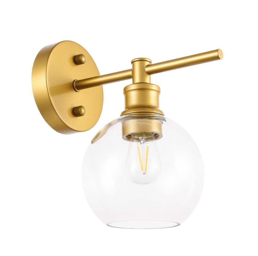 The Collier Collection of lights will be sure to have your guests admire your modern sense of style with the beautiful simplicity of its shape and form. The sleek curvature of the ball shaped shade creates the juxtaposition of intricate simplicity, achieving a style that has both form and function. This wall lamp can be oriented facing up or down, and can shine by itself or paired with another to create an even brighter illumination that will brighten any home. Available in a brass, chrome, or black finish with either a clear or frosted ball glass shade, it is the perfect wall lamp to enhance your bathroom, foyer, or hallways, allowing you to always live in chic and fashionable lifestyle (light bulbs not included).
