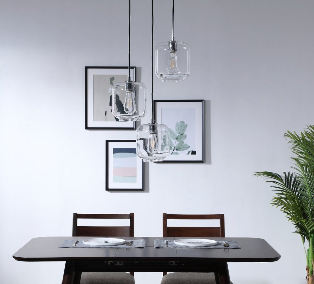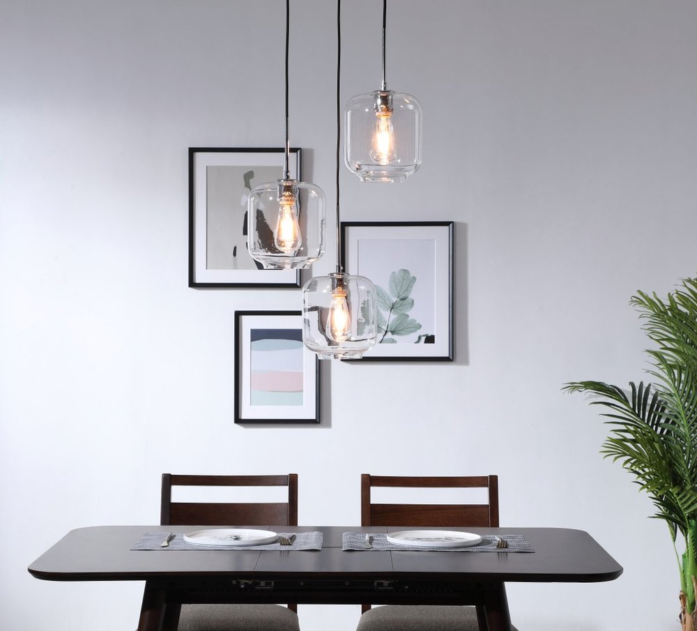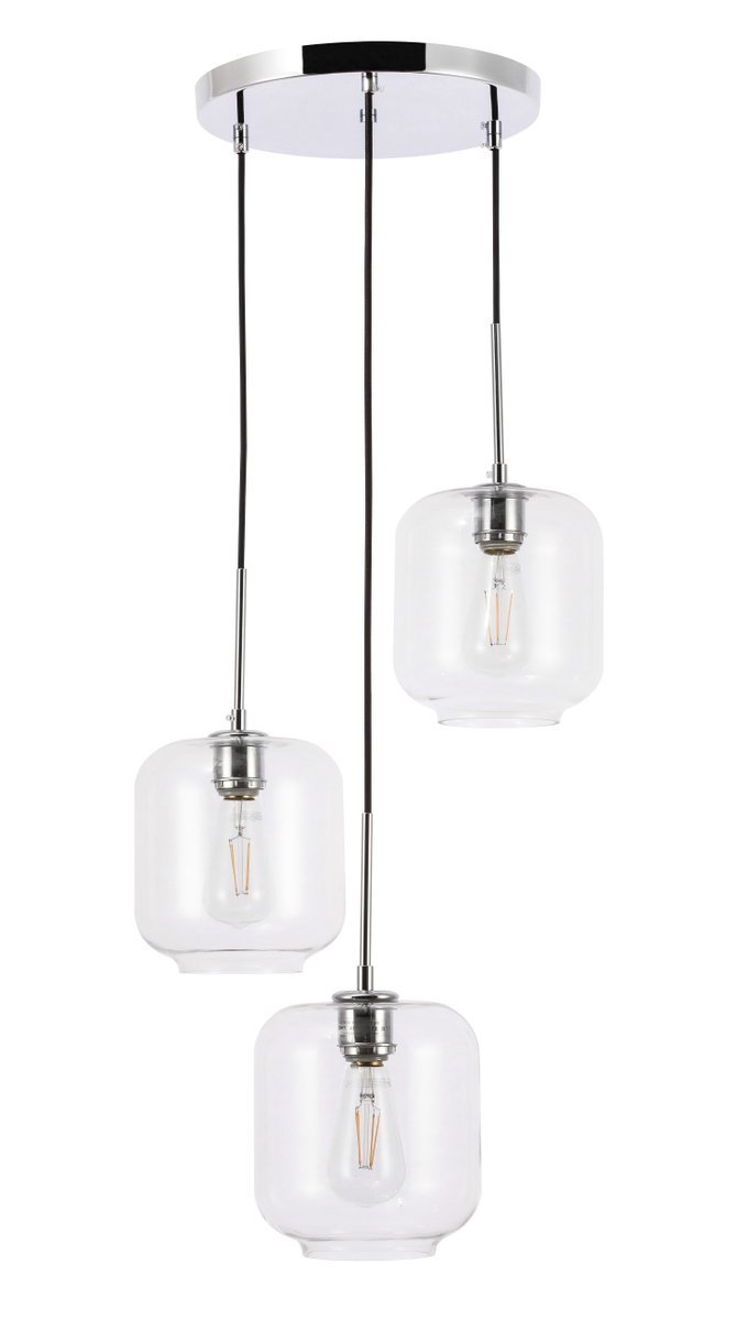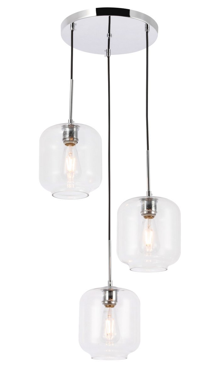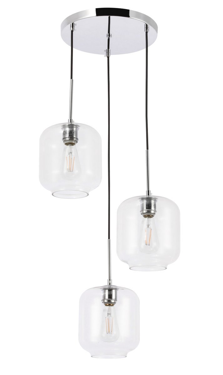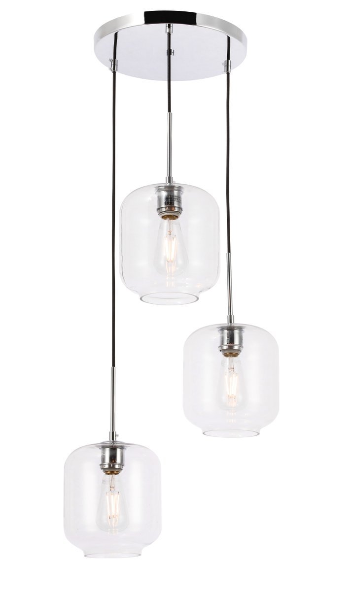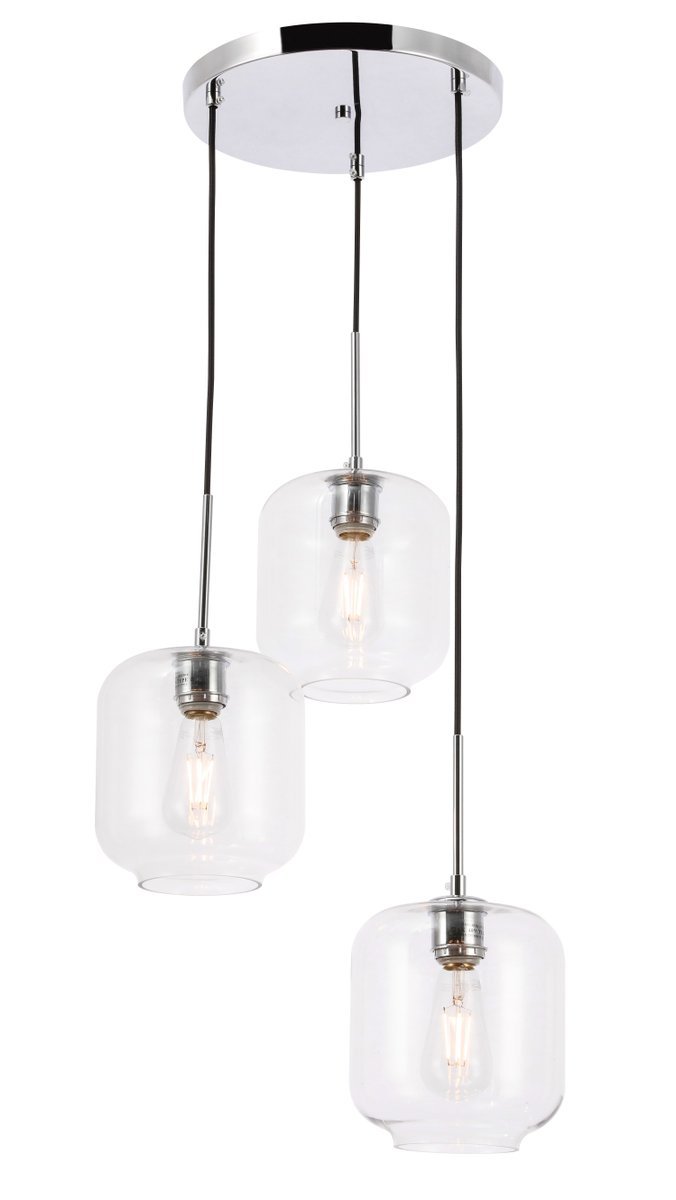 The Collier Collection of lights will be sure to have your guests admire your modern sense of style with the beautiful simplicity of its shape and form. The canopy supports three pendant lights that can be adjusted to different heights in order to create dramatic levels of lights and shadows. The pendant's clean lines created by the cords and curvature of the cylinder shades makes this the perfect lighting addition to any home that is in need of a chic modern flair. Available in a brass, chrome, or black finish, with either a clear or frosted cylinder glass shade, enhance your dining room, living room, or bedroom with the Collier Collection hanging pendant and live a chic and fashionable lifestyle, no matter where you are (light bulbs not included).