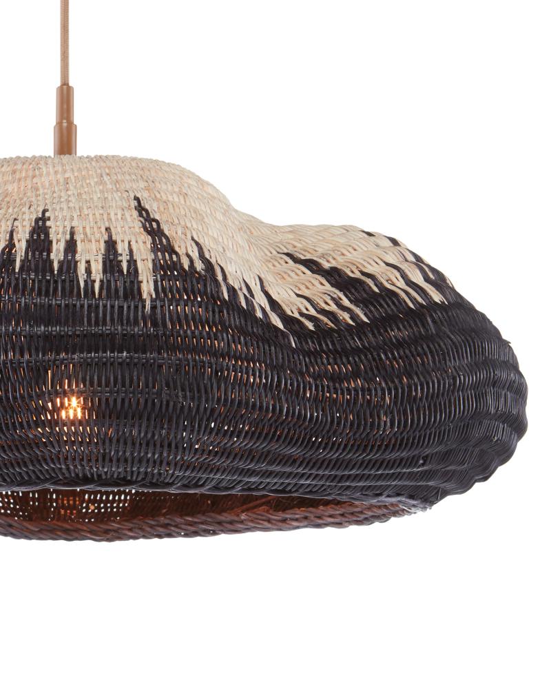 The Comme Des Paniers Pendant was inspired by wicker bags our design team saw in Paris. Panier in French means basket, the name a nod to the basket-weave it took to achieve this cloche-like shade. A detail of note is how the two-tone wicker shade looks as if there is a flame flowing up it. The wrought iron hardware on this basket-weave pendant is in a Khaki finish. Adjustable from 15.5" to 129.5" with use of included chain/rod kit/cable. If your space calls for a longer drop, additional chain/rods/cable is available for purchase.