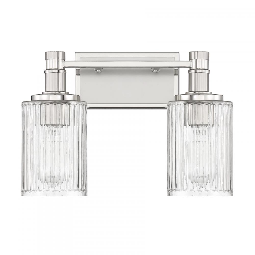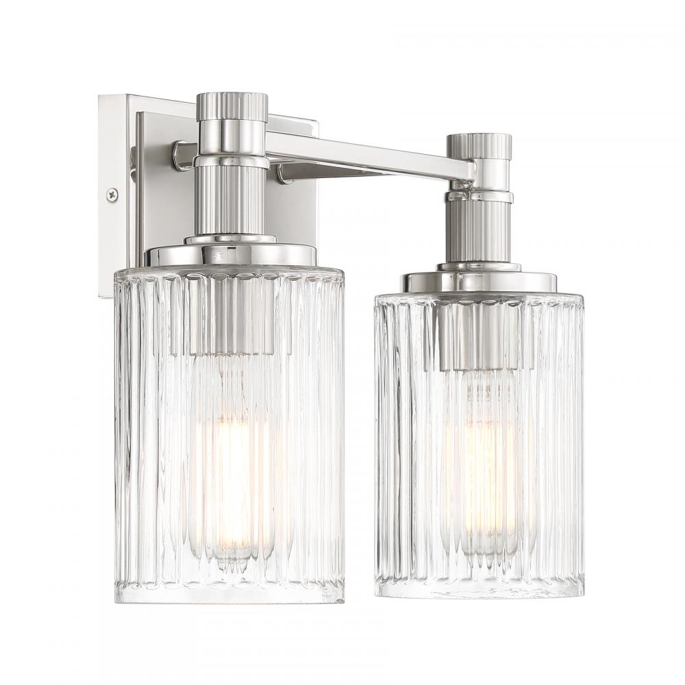 Add a big dose of shimmer with the Concord 2-light bath vanity light from Savoy House. Its ribbed glass shades are paired with ribbed detailing on the arms, boosting the inviting texture. The Silver and Polished Nickel finish helps every element shine. Concord is 10.5" in height, 15" in width and extends 6.5" from the wall. Uses two standard size bulbs of up to 60 watts per bulb. Bulbs not included. Damp area rated. Must be installed as shown.