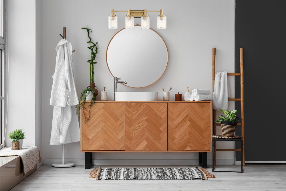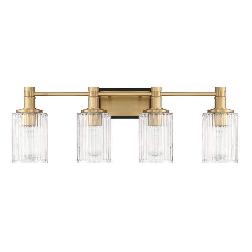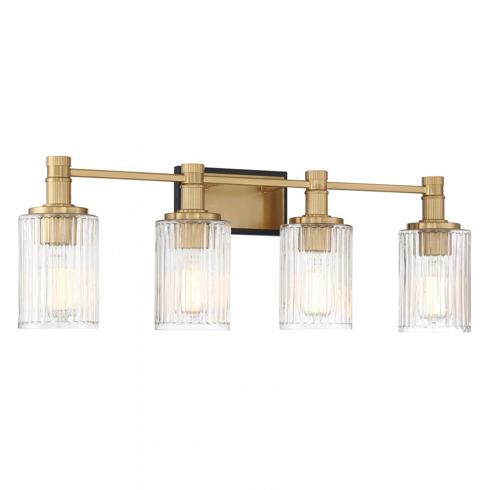 Add a big dose of shimmer with the Concord 4-light bath vanity light from Savoy House. Its ribbed glass shades are paired with ribbed detailing on the arms, boosting the inviting texture. The Matte Black and Warm Brass finish helps every element shine. Concord is 10.5" in height, 30.75" in width and extends 6.5" from the wall. Uses four standard size bulbs of up to 60 watts per bulb. Bulbs not included. Damp area rated. Must be installed as shown.
