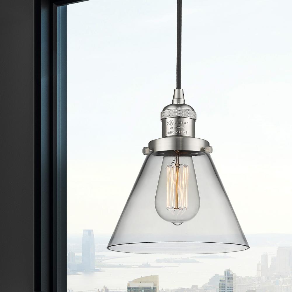Cone - 1 Light - 8 inch - Brushed Satin Nickel - Clear Shade - Cord hung - Mini Pendant