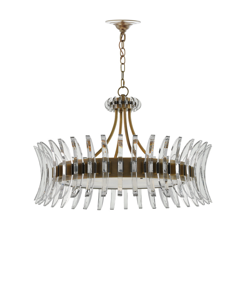 The Coquette Chandelier is a modern iteration of Art Deco artistry made of slices of optic crystal and metal in an antique brass finish. The crystal blades that line the brass chandelier read like half-moon slivers to bring the fixture a luminous warm-cool sense of glamour. Adjustable from 25.25" to 94.25" with use of included chain/rod kit/cable. If your space calls for a longer drop, additional chain/rods/cable is available for purchase.