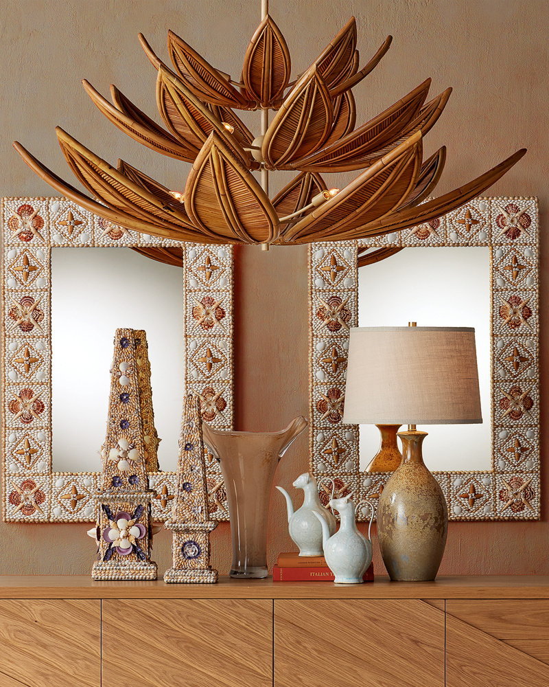 The Coquillage Tall Obelisk is a shell-encrusted sculpture inspired by a mosaic wall created in coquillage, one of the world’s oldest art forms that utilizes natural shells. The complex pattern, which includes floral motifs in pale peach, white, and purple tones, is affixed to the shape made of wood. Standing 31 inches tall, this shell sculpture will be a commanding decorative accessory.