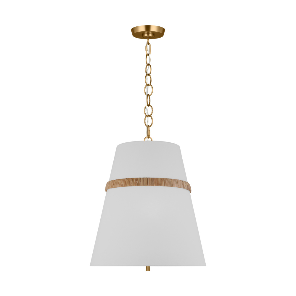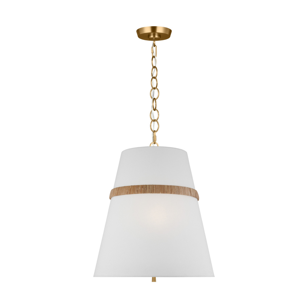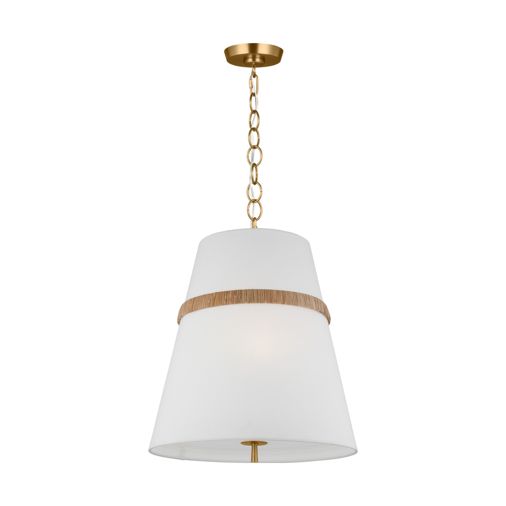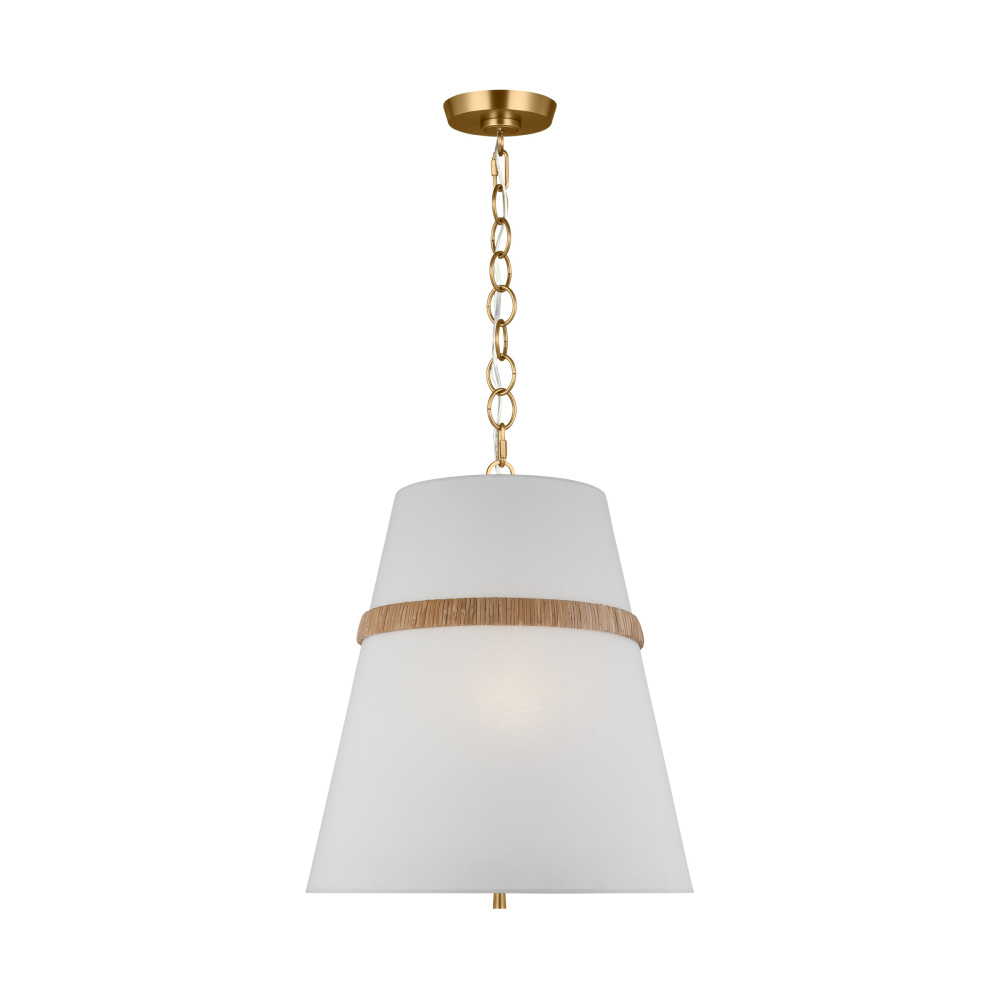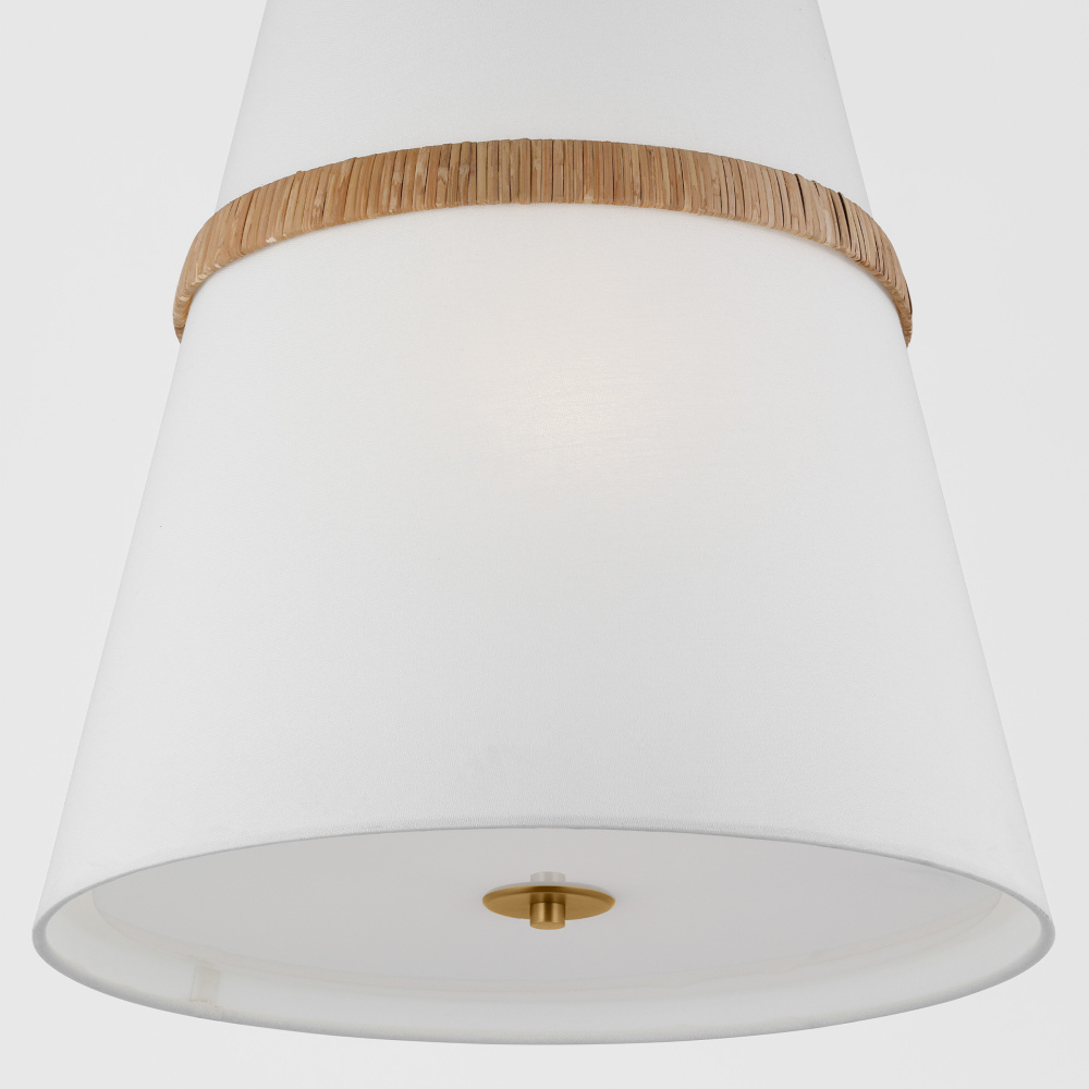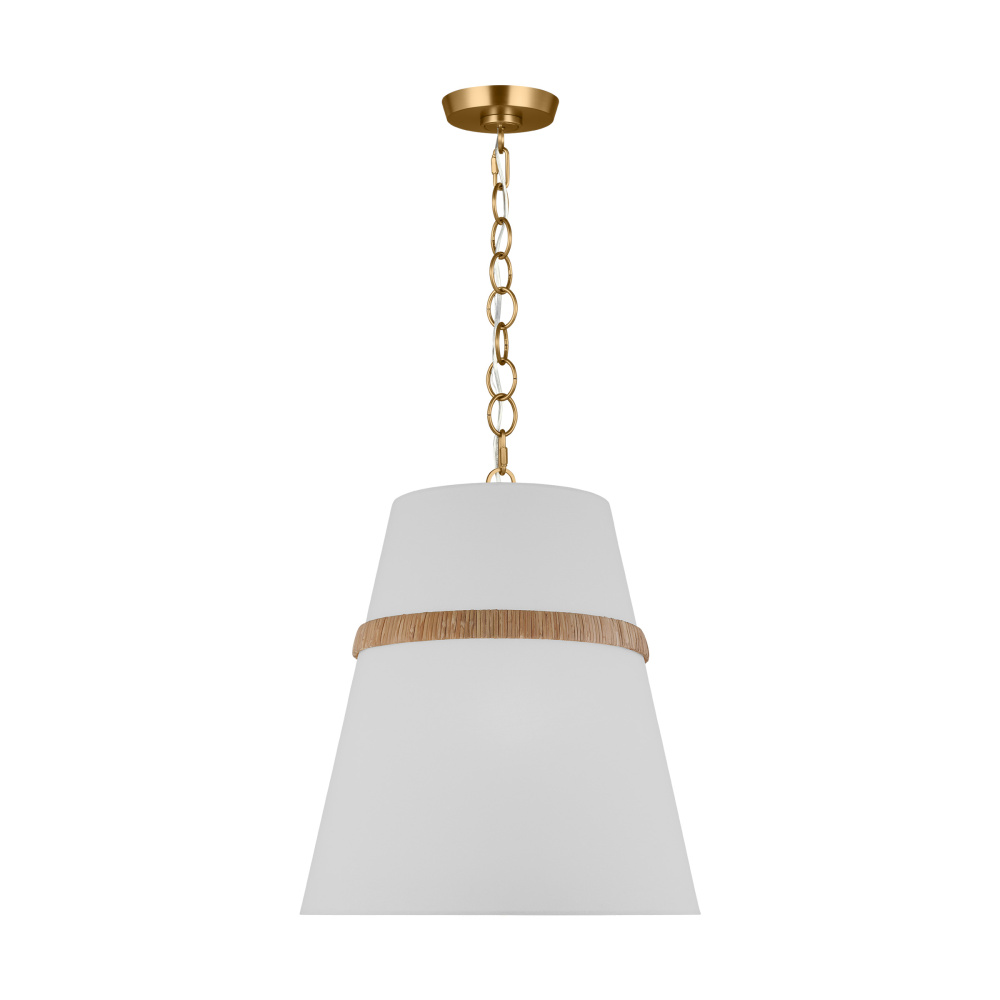 The Cordtlandt series by Alexa Hampton has a simple, purposeful design that makes it a perfect addition to any uptown chic décor. The cylinder-shaped pendant features etched glass diffuser, an over-scaled chain and a decorative end stem that ties the look together. Updated with a rattan woven ring detail elevates the design with a coastal vibe.