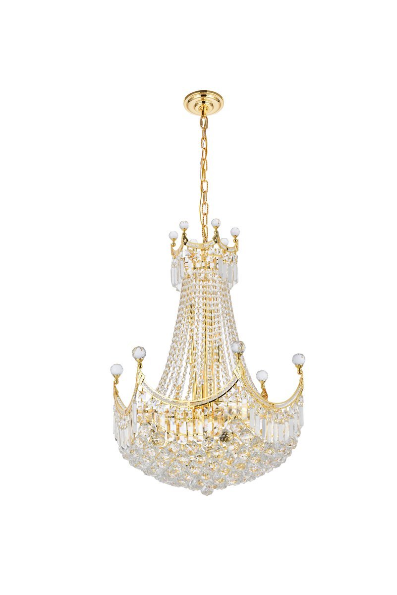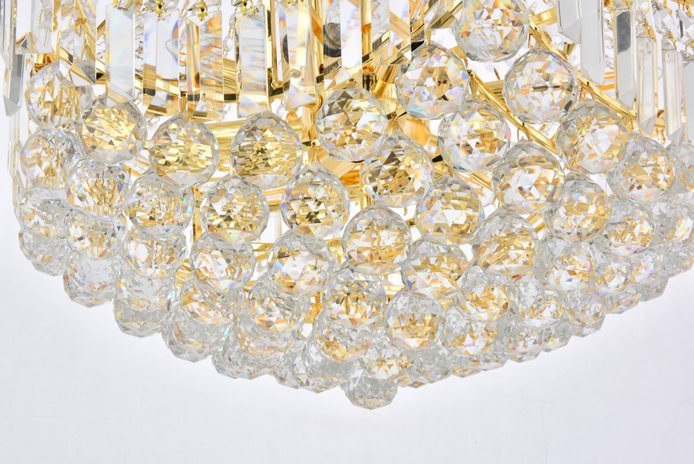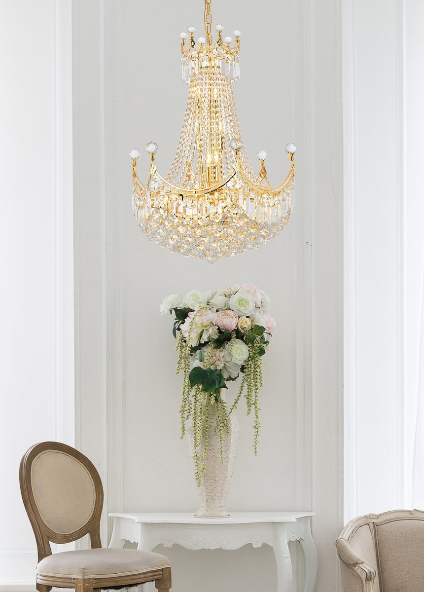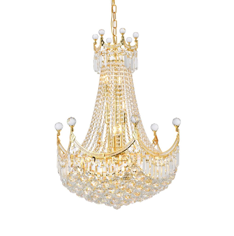 An empire-style chandelier brimming with sparkle, Corona collection hanging fixtures fill a home with brilliant light. The base of the frame forms a hemisphere that is overflowing with clear crystal balls and faceted prisms and tipped with matching crystal balls. Draped crystal octagon strands dangle along the body of the lamp while a gorgeous crystal "crown" matches the edges of the frame, completing the look and giving the design its name. Available in one, two, or three glorious tiers a chrome or gold finish that is dazzling in a dining room, stairwell, or living room.